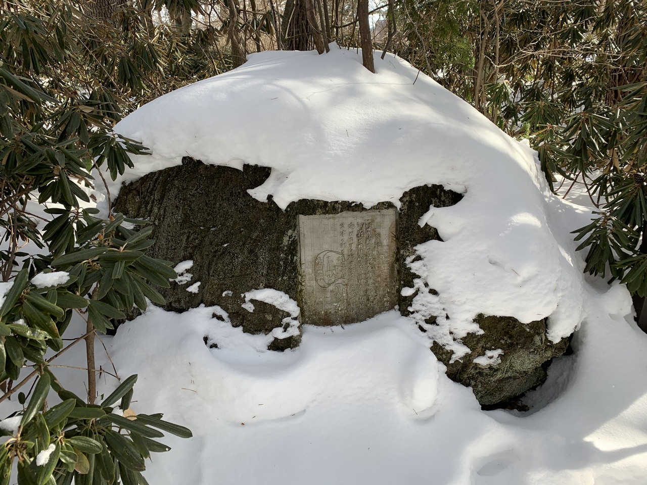 その周辺には沼神社、諏訪神社、三峰神社と小さなお宮もあり、松尾芭蕉、十返舎一九など文学者の碑が点在していてそれなりに見どころはあるのですが、なんせ雪を踏みしめながら進むため足元に注意が必要です。高村光太郎の碑が見たくてなんとか辿り着きましたが、碑自体が半分雪に埋もれていました。まあそうですよね、スキー場がすぐ近くにあるくらいですから。散策していると日本相撲協会の相撲研修道場があり、雪で真白くなった公園内の広場に土俵がありました。