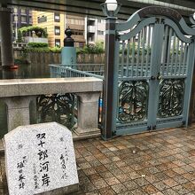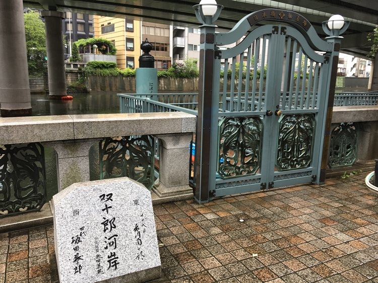 東京在住時は「地点」としてしか意識のなかった日本橋。題字の額もふくめ、橋としての日本橋を一度見ておきたいと思い、改めて訪問です。南詰、東側の滝の広場の船着場のところに碑があります。双十郎の由来は2011年に歌舞伎役者の四代坂田藤十郎と十二代市川團十郎がここから乗船したことにあるそうです。銘の中央には中央区長、その左右にお二人の直筆が刻まれていました。