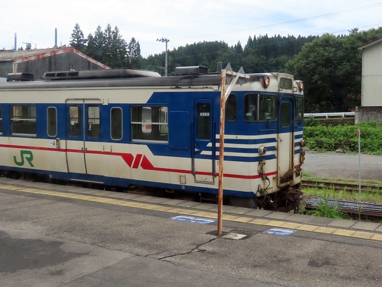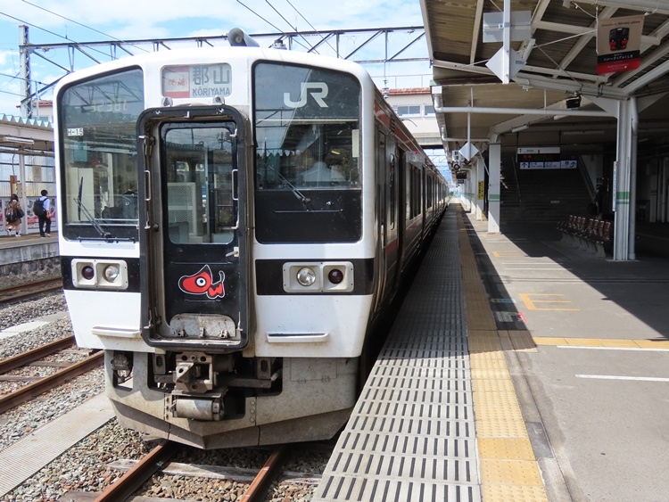 新津から郡山へ。新潟県と福島県を結ぶ内陸線。途中ほとんどの列車が会津若松で乗換えになります。愛称は森と水とロマンの鉄道。新潟県から福島県に入ってくるまでは、阿賀野川沿いに走る区間があるぐらいで、印象に残る車窓には出会いませんでした。会津盆地を通過するときの田園風景のほうがイメージが強い。会津若松~郡山は電化されている区間ですが、案外運行本数は多くなく、便利さでは都市間バスと競合しているようです。