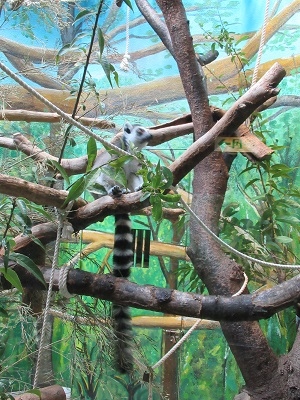 ワオキツネザルとシロクロエリマキキツネザルがいて、ペットボトルを使った餌やり等の工夫がなされている。