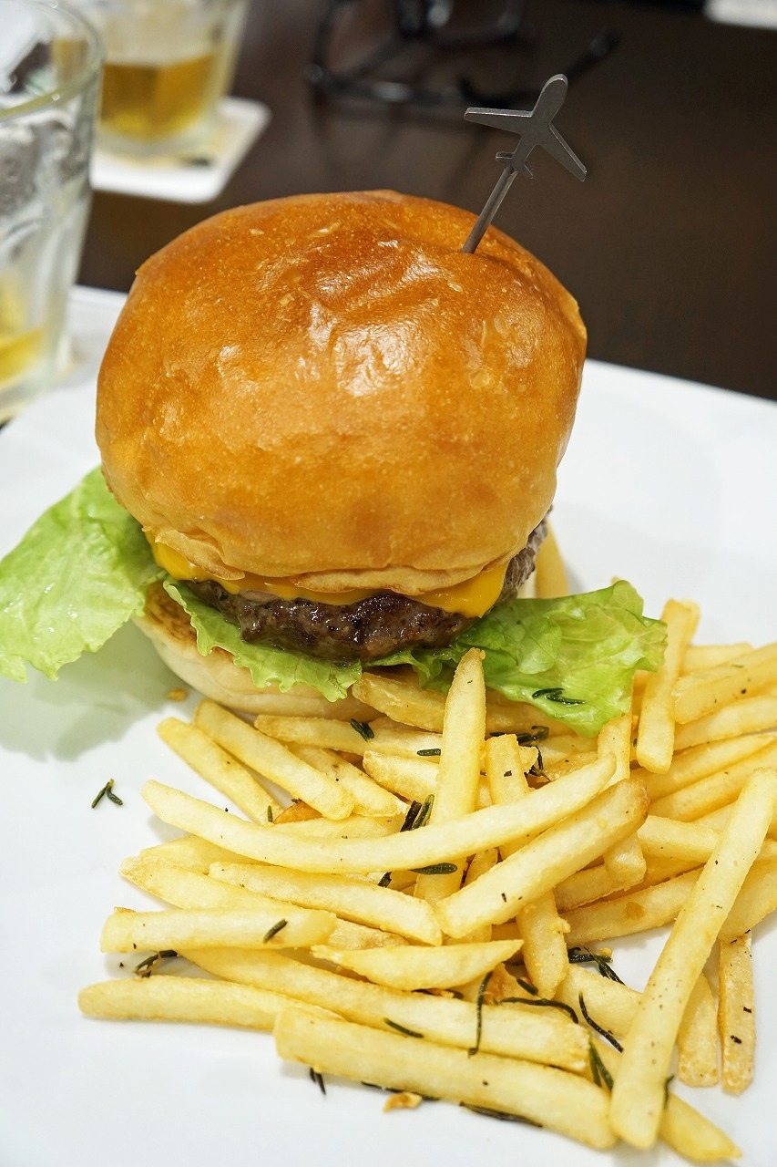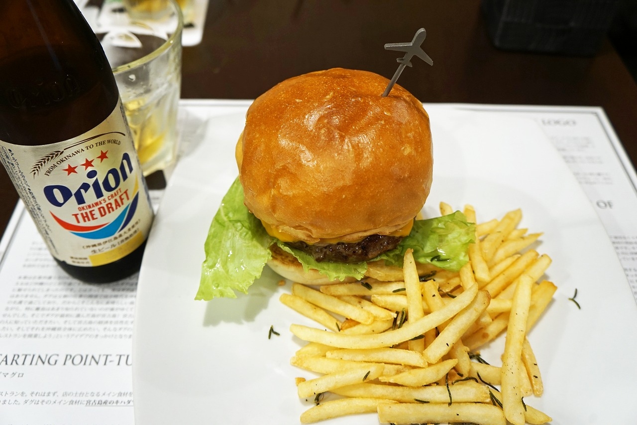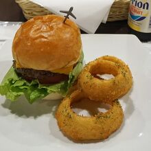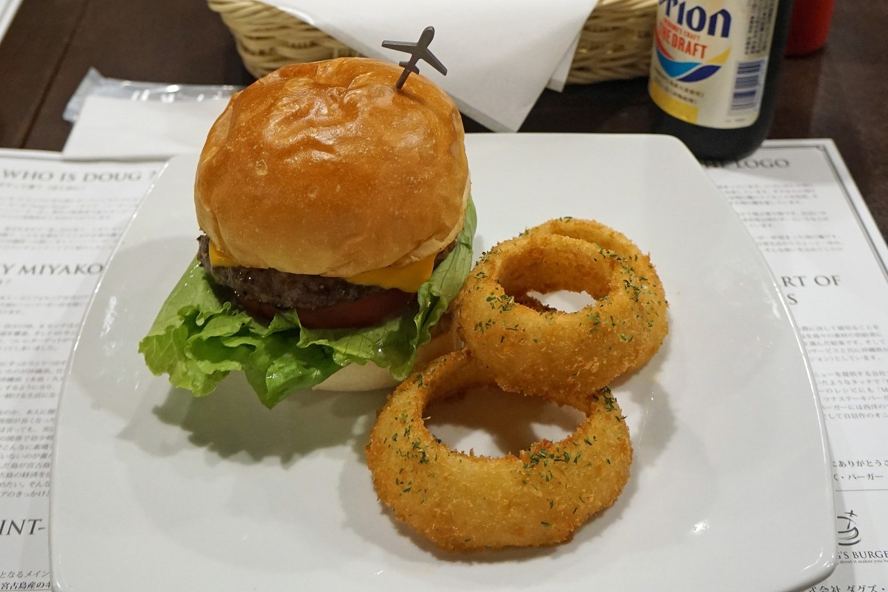 日曜日に妻と2人でお昼を食べに行きました。ユーグレナモール自体が日曜日はお店も休みが多いのかお客さんはいなくて空いていました。金額からも地元の人が気軽に入る店では無いと思います。2人共チーズバーガーのセットを注文しましたが、アルコール類も同じ料金なのが嬉しいです。コロナビールでは無いなと思いオリオンビールとサイドメニューはフライドポテトとオニオンリングをお願いしました。かなり高さのあるバーガーですが、挟む紙袋があるので食べやすいです。バーガーはあまり大きくはありませんが、がっつり肉の味のするハンバーグなので食べごたえはありました。