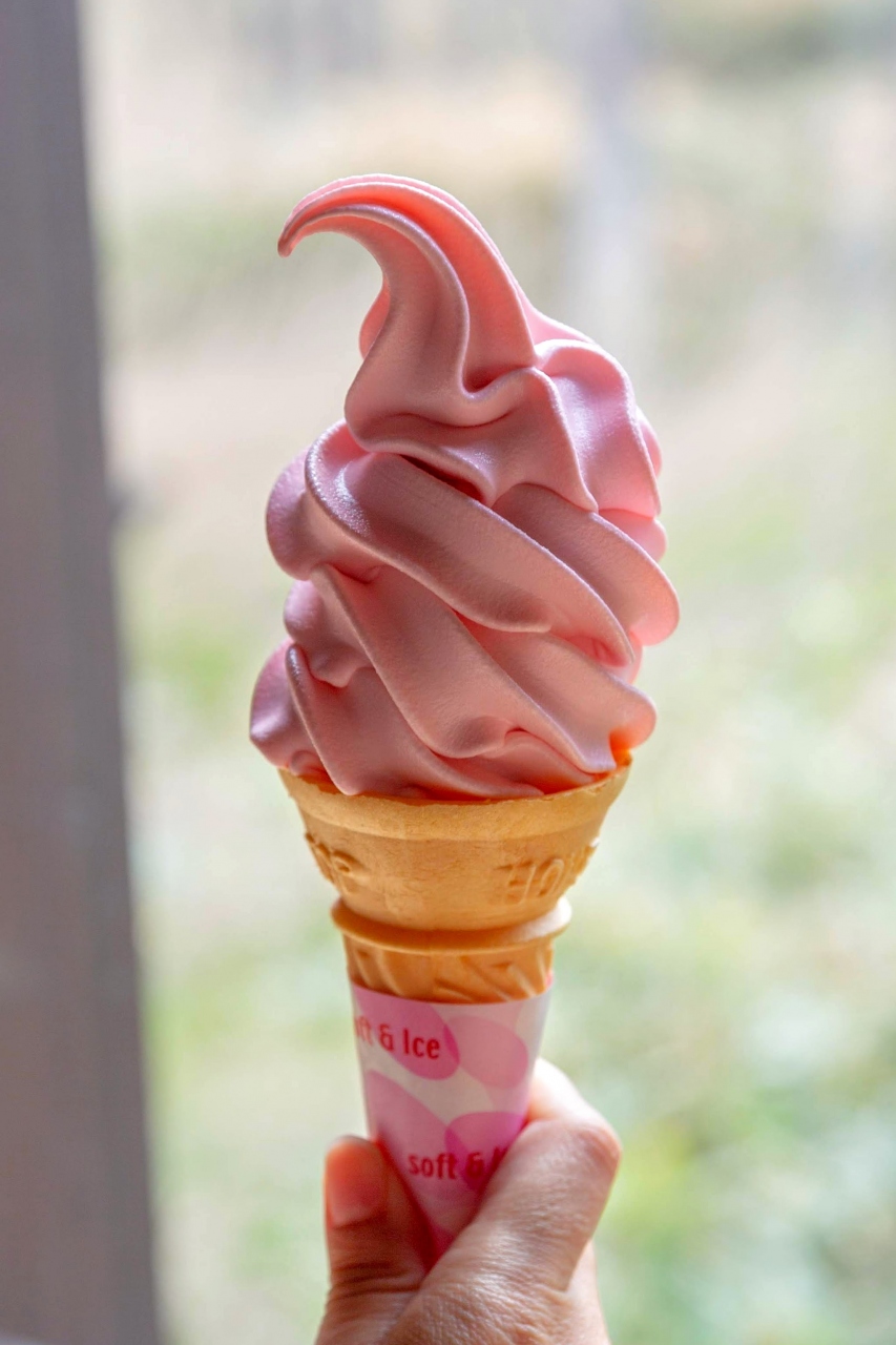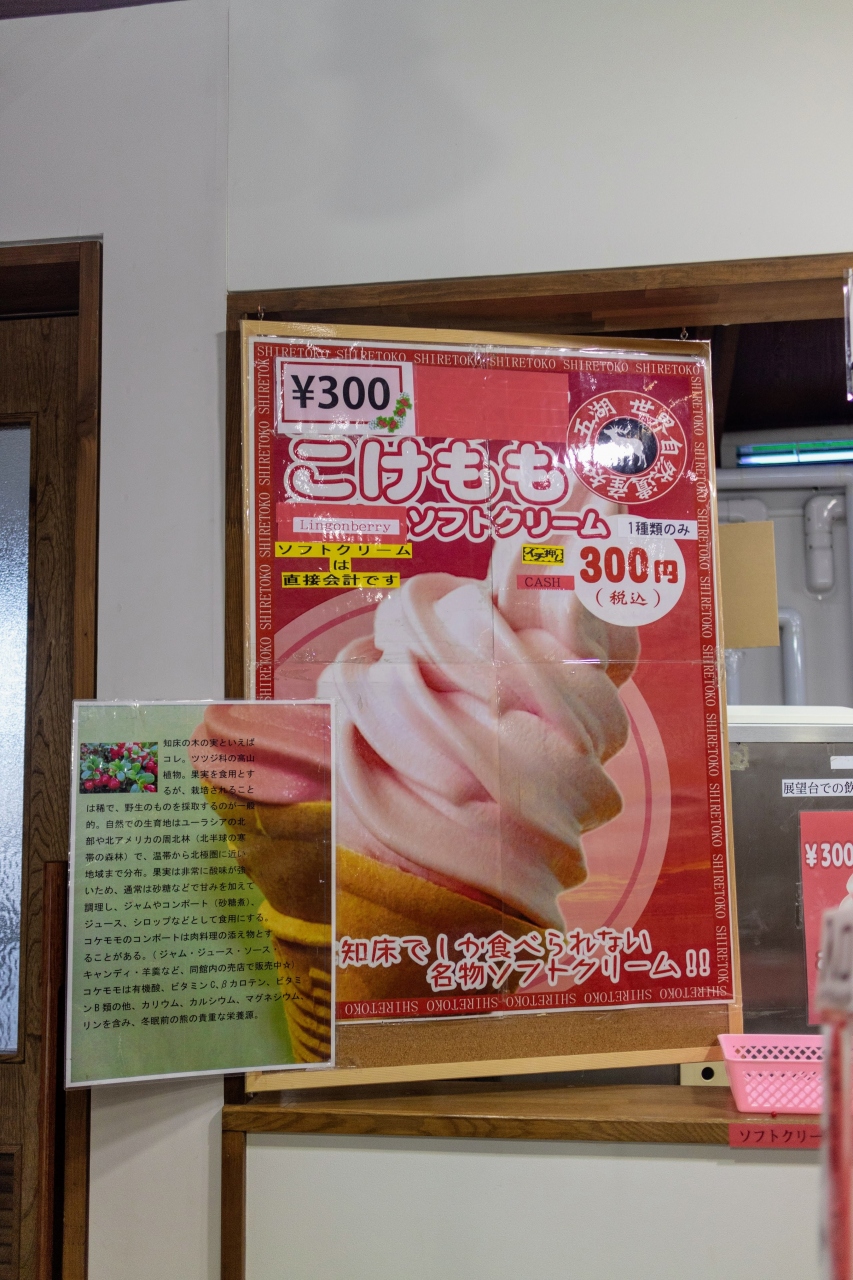 北海道・知床五湖にある「知床五湖パークサービスセンター 」。こちらでは「こけももソフトクリーム」を食べました。「こけもも」が何か皆さん分からないですよね。クランベリーやブルーベリーと同じ「ツツジ科スノキ属」の果実です。酸味が特徴ですが、たとえるのでしたら甘酸っぱいもも系の風味ですね。ソフトクリームはなめらか系でミルク感もあり美味しいです。昔は「はまなすソフトクリーム」もあったのですが、もう作っていないそうです。食べてみたかったです、残念・・・
