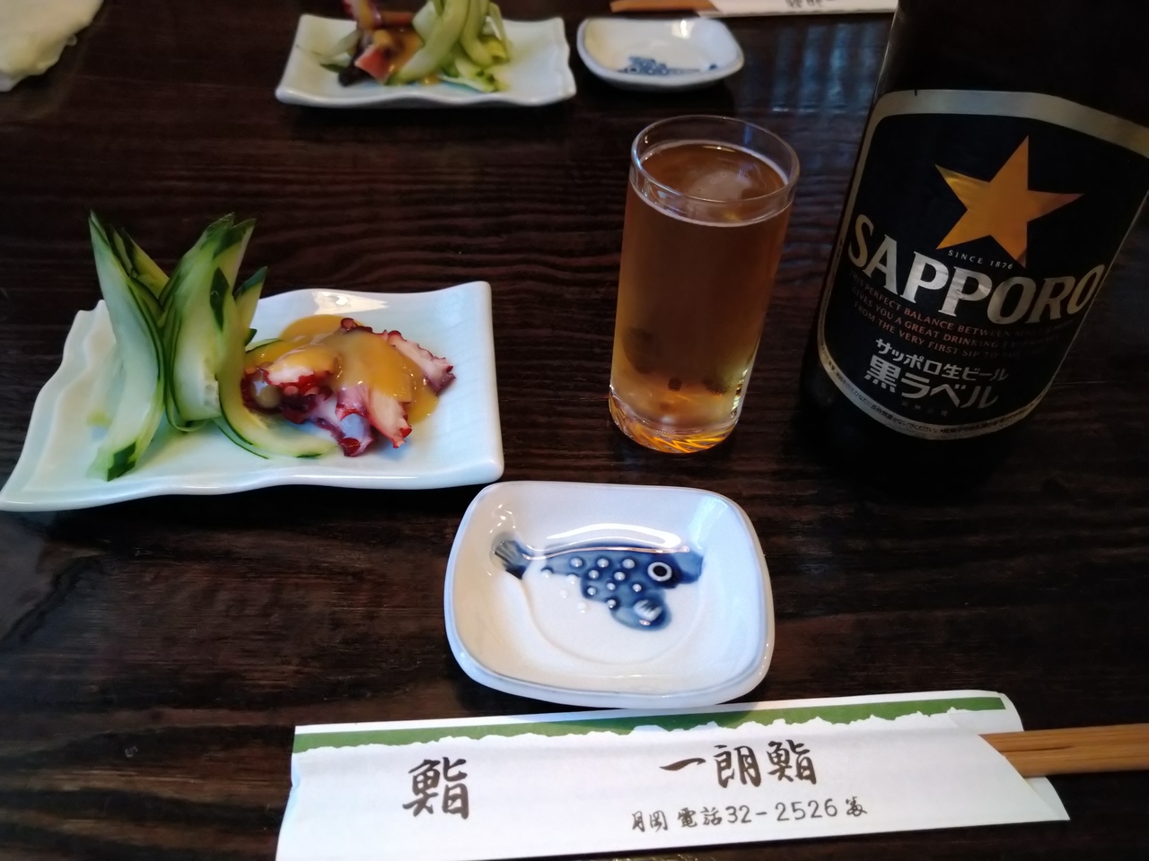 酢味噌和えの蛸がお通しで、ビールが黒ラベル大瓶なのも良かった!