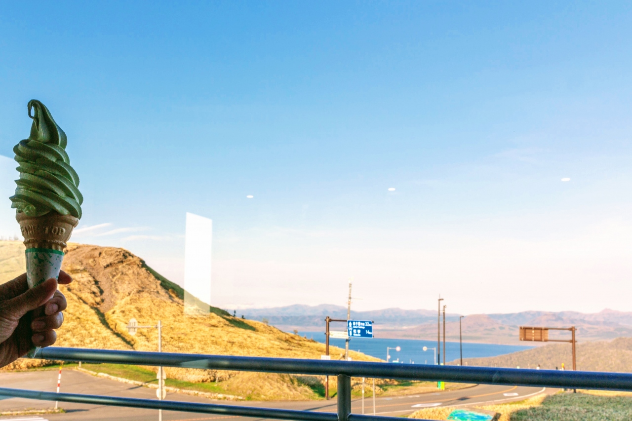 北海道・女満別空港から車で1時間、美幌峠の頂上にある「道の駅 ぐるっとパノラマ美幌峠」、北海道で峠にある道の駅と言えば・・・「あげいも」! 美幌峠も中山峠と同じくあげいもが名物ですが・・・もう1品名物があります。それが「熊笹ソフトクリーム」です。熊笹と言っても、味は抹茶風で渋すぎず、ソフトクリームは甘すぎず大人なお味です。軽いシャーベット感がありミルク感はほどほどでさっぱりとしたソフトクリームで食べやすいです。ドライブの休憩には、このようなさっぱりとしたソフトクリームが良いですね~