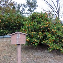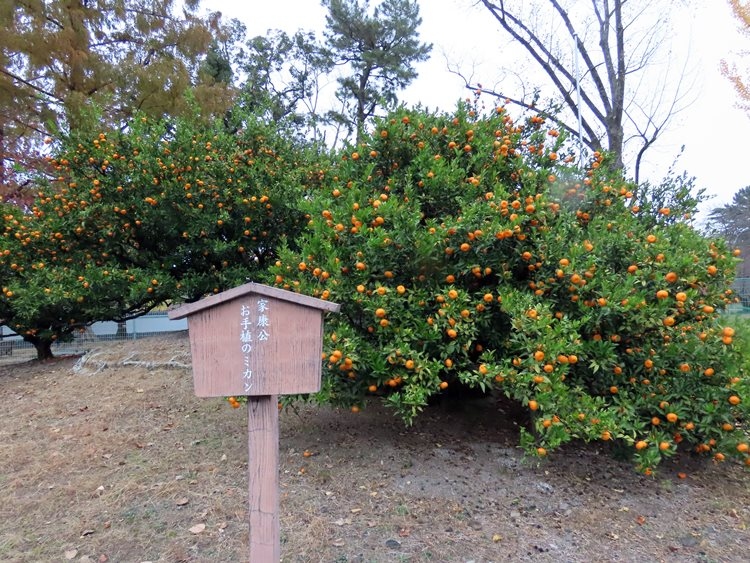 駿府城公園の家康像のすぐ近くにあるみかんの木で県の天然記念物に指定されて柵に囲まれて保護されています。家康が駿府城に隠居した後に、紀州から贈られた鉢植えのみかんを本丸に植えたと伝えられていますが、天然記念物指定は1950年で、現在の樹の大きさはかなり大きく、無数の実がなっていました。長い期間、相当ていねいに手入れをされていたことをうかがわせました。