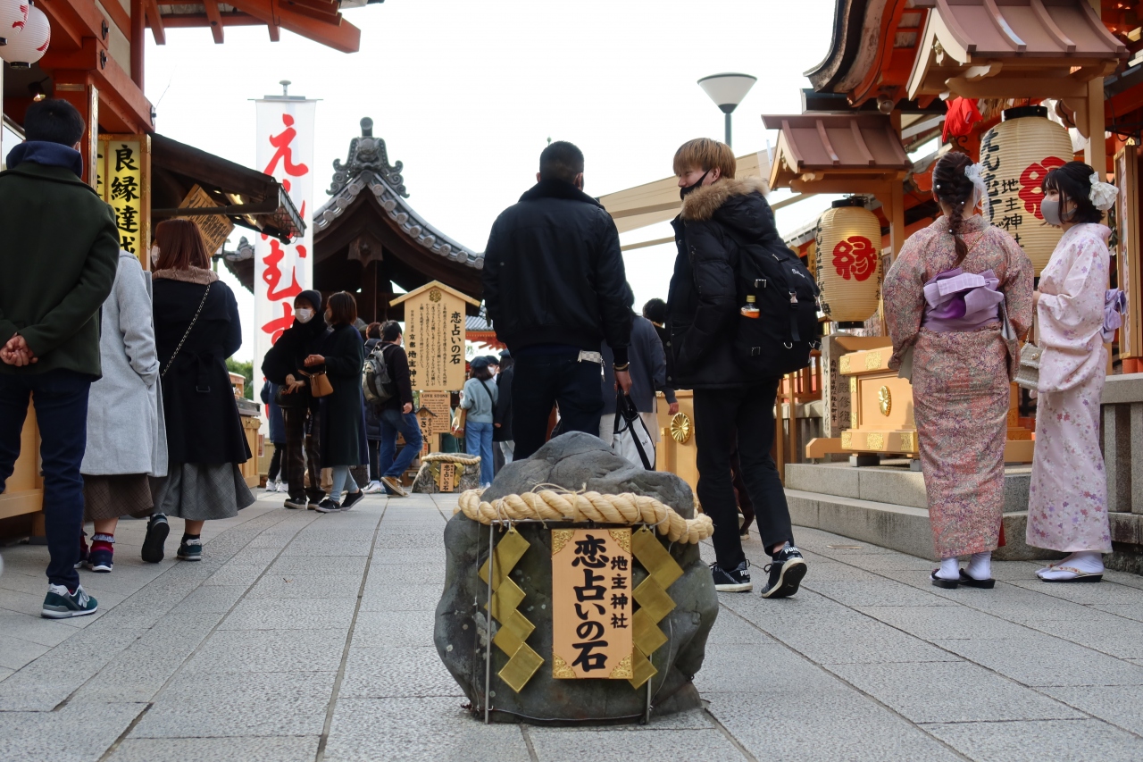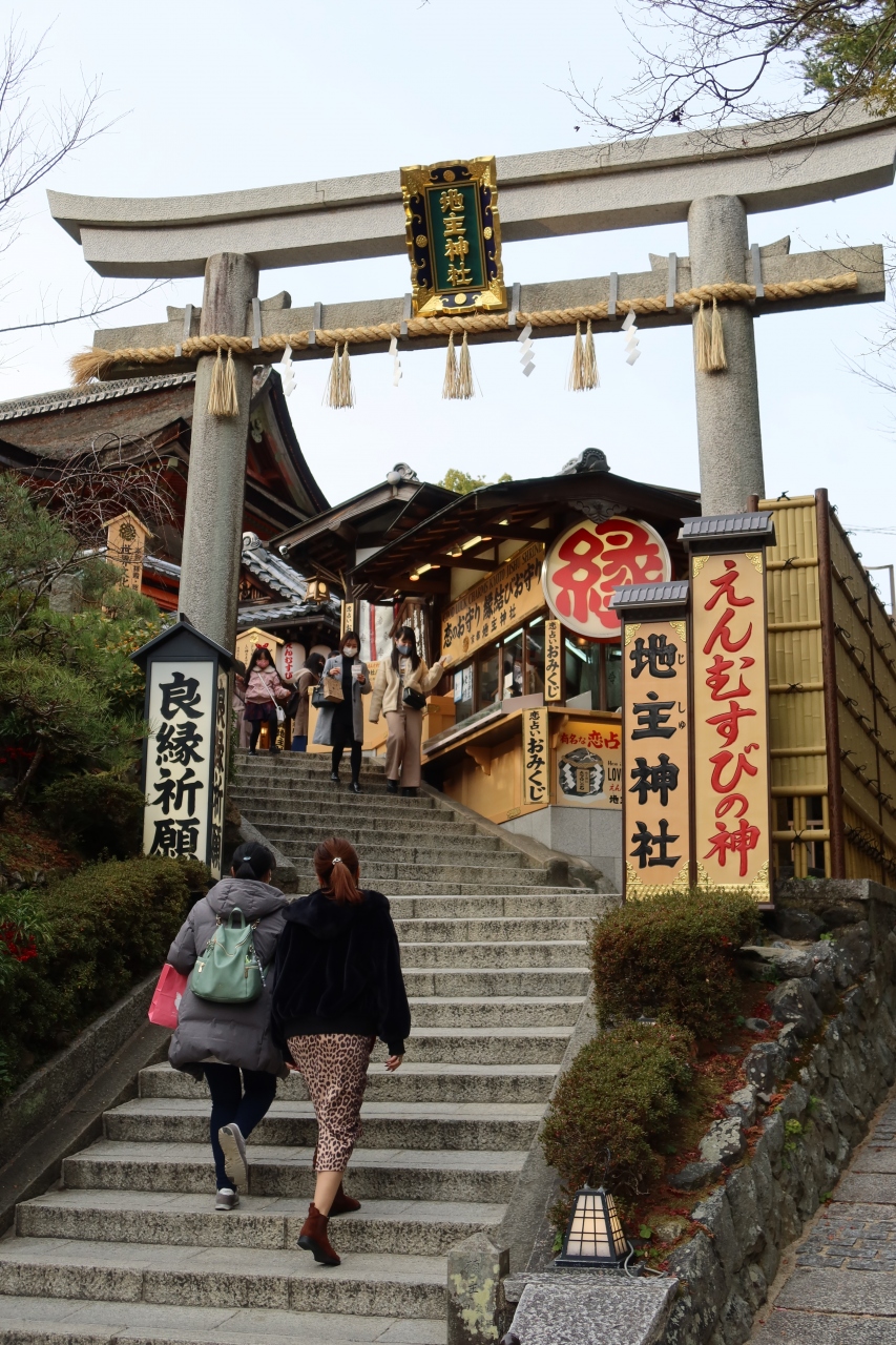 清水寺の本堂の裏、北側の一段高くなった所にある神社が地主神社です。縁結びのパワースポットとして滅茶苦茶有名な神社。その中でも恋占いの石は特に有名。目を閉じて歩き、二つの石の間を歩ければ恋愛が叶うと言われています。それ故、縁結び祈願者がうじゃうじゃ。既婚者やカップルは行く必要ないですね。