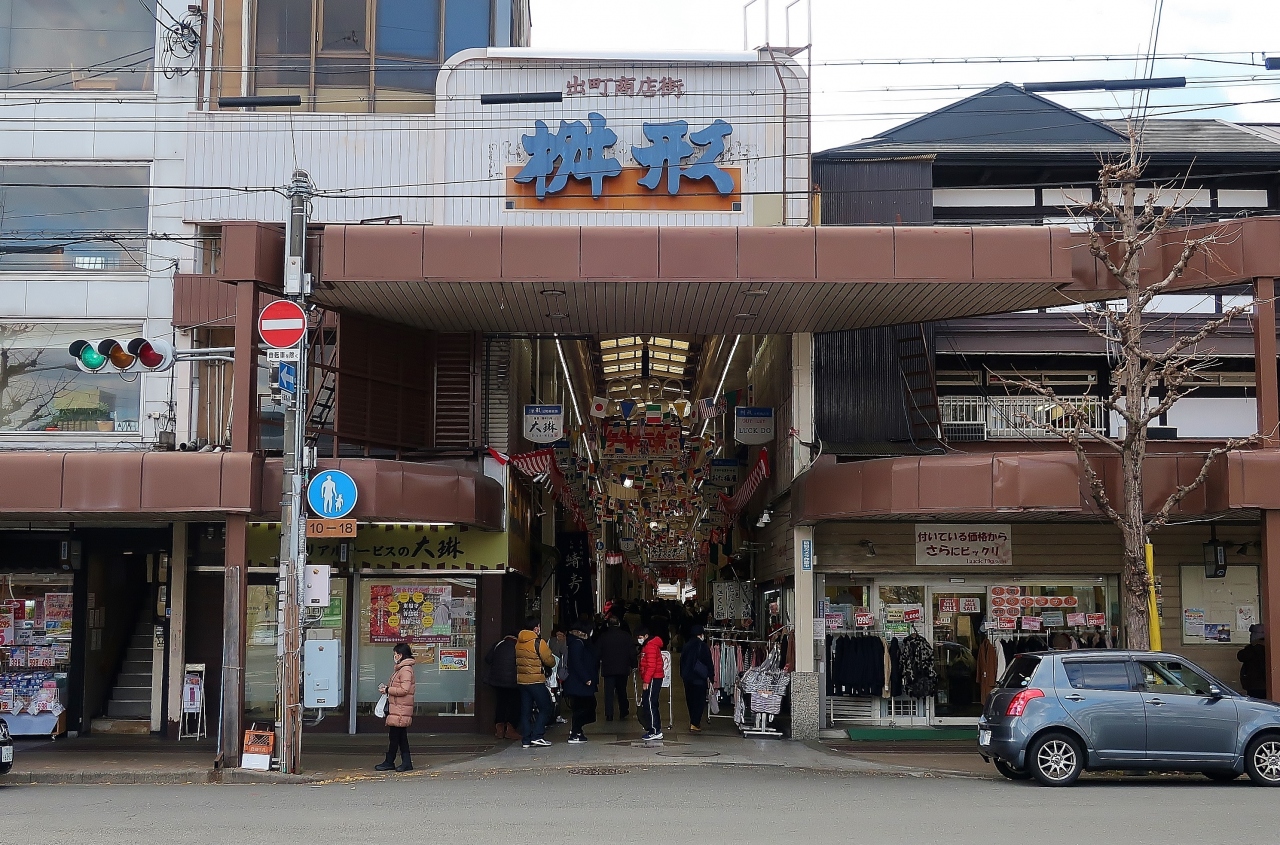市営の京都出町駐車場がある交差点。ここから始まるのが出町桝形商店街だ。豆餅で知られる出町ふたばの近くといったほうが有名かもしれない。商店街の飾りがちょっと「昭和」だ。万国旗が天井を飾り、「いつもあなたのそばにいる「今年も元気だ」などのキャッチフレーズが大書してある。商店街の中のスーパーをのぞいたが、京都らしい食品が多く、思わず買い物。市営駐車場の無料駐車券がもらえたのでラッキーだった。観光型ではなく、完全な生活型商店街だ。