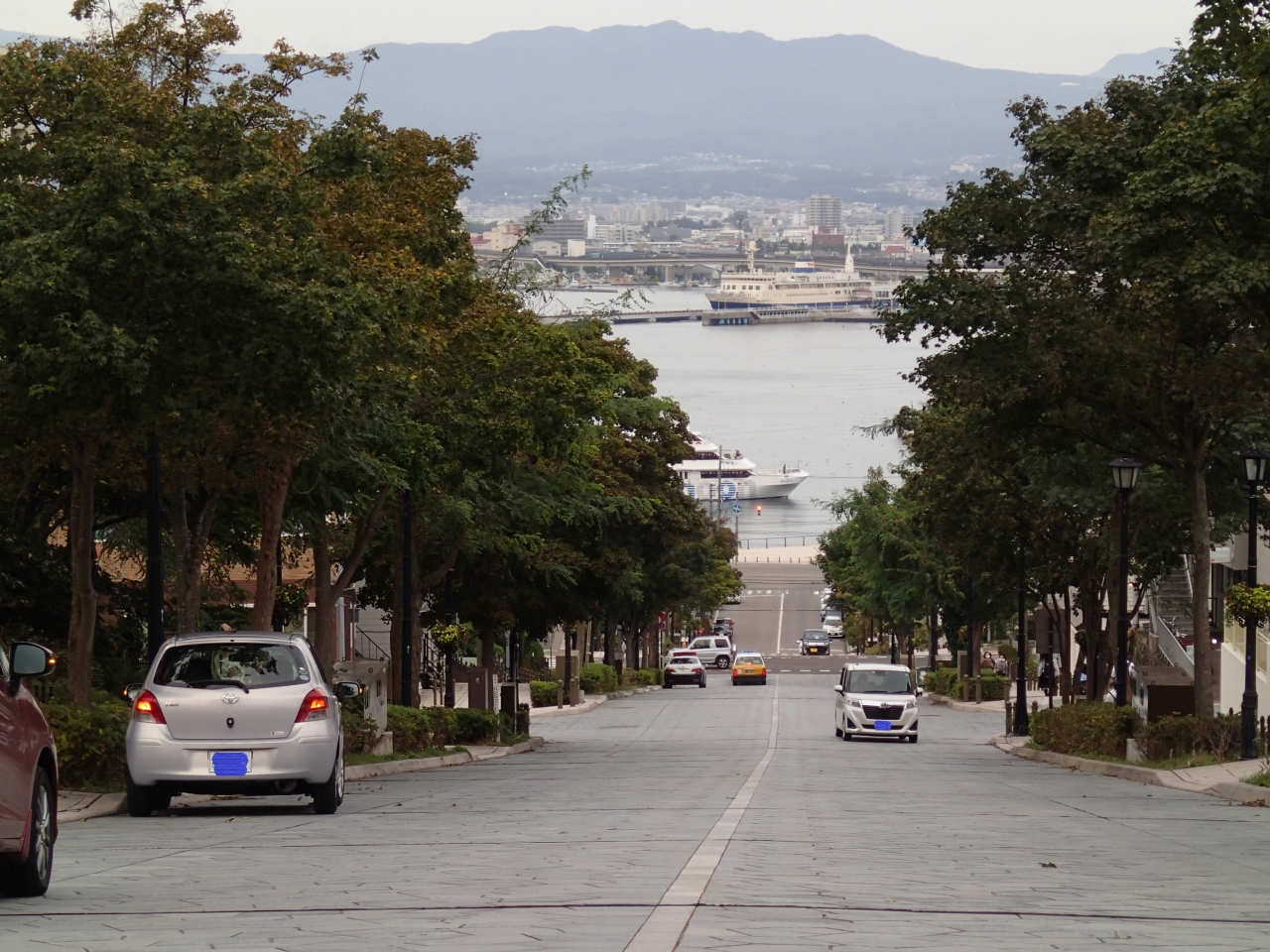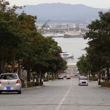 係留展示されている青函連絡船記念館摩周丸と函館港を発着するクルーズ船を覗くことが出来ます。かつては坂を上りきったところに函館八幡宮があったことから、八幡坂と名称がつけられたようです。