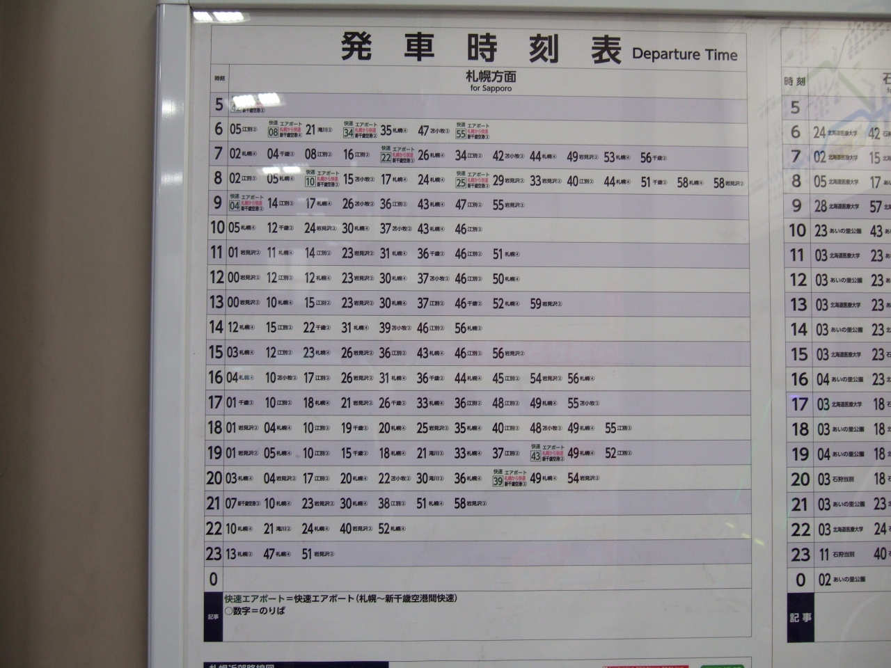 函館から小樽を回り、旭川までを結んでいる長い路線。小樽から札幌、岩見沢は通勤路線で本数が多く、特に桑園から札幌の間は札沼線とも並んで走るので、本数が多くて便利です。でも、運転間隔がほとんど均等な札沼線に比べて時間がマチマチで、しばらく間が空くのは改善してほしいです。