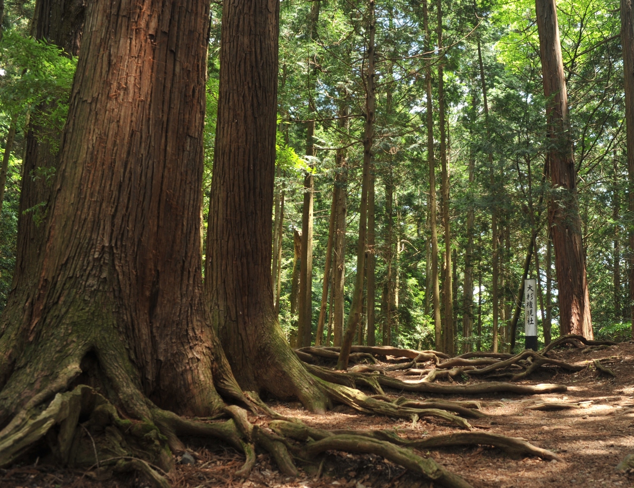 大杉権現は樹齢千年に近い杉の巨木で、信仰を集めている。周辺は大杉苑瞑想道場と呼ばれ、鞍馬寺きってのパワースポットだ。杉の巨木が林立し、足元には杉の根が地面を覆うようにうねっている。この場で杉の木立で覆われた空を見つめていると、エネルギーが降り注いでくるような気になる。
