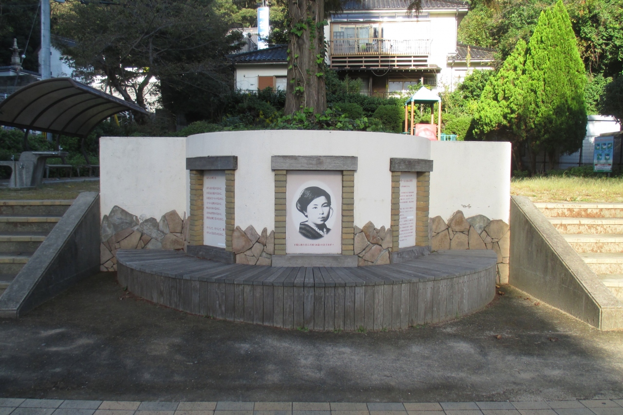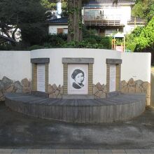 金子みすゞは、母の再婚に付いて、20歳の時に仙崎から下関に出てきます。実は、母の再婚先は叔母さんの嫁ぎ先だった書籍卸業の上山文英堂で、叔母さんが亡くなったので、再婚話となったものです。みすゞ自身も上山文英堂の支店で働く様になり、この頃から童謡詩の才能が開花しています。上山文英堂の本店はこの近くにあったことから、ここに金子みすゞ顕彰碑が建てられています。この公園そのものがゆかりがあるということではなさそうです。顕彰碑はみすゞの写真と2枚のパネルで構成されていて、写真は20歳頃、1枚のパネルには「みすゞと上山文英堂」について書かれ、もう1枚のパネルには「「はちと神さま」が書かれています。