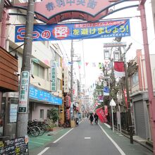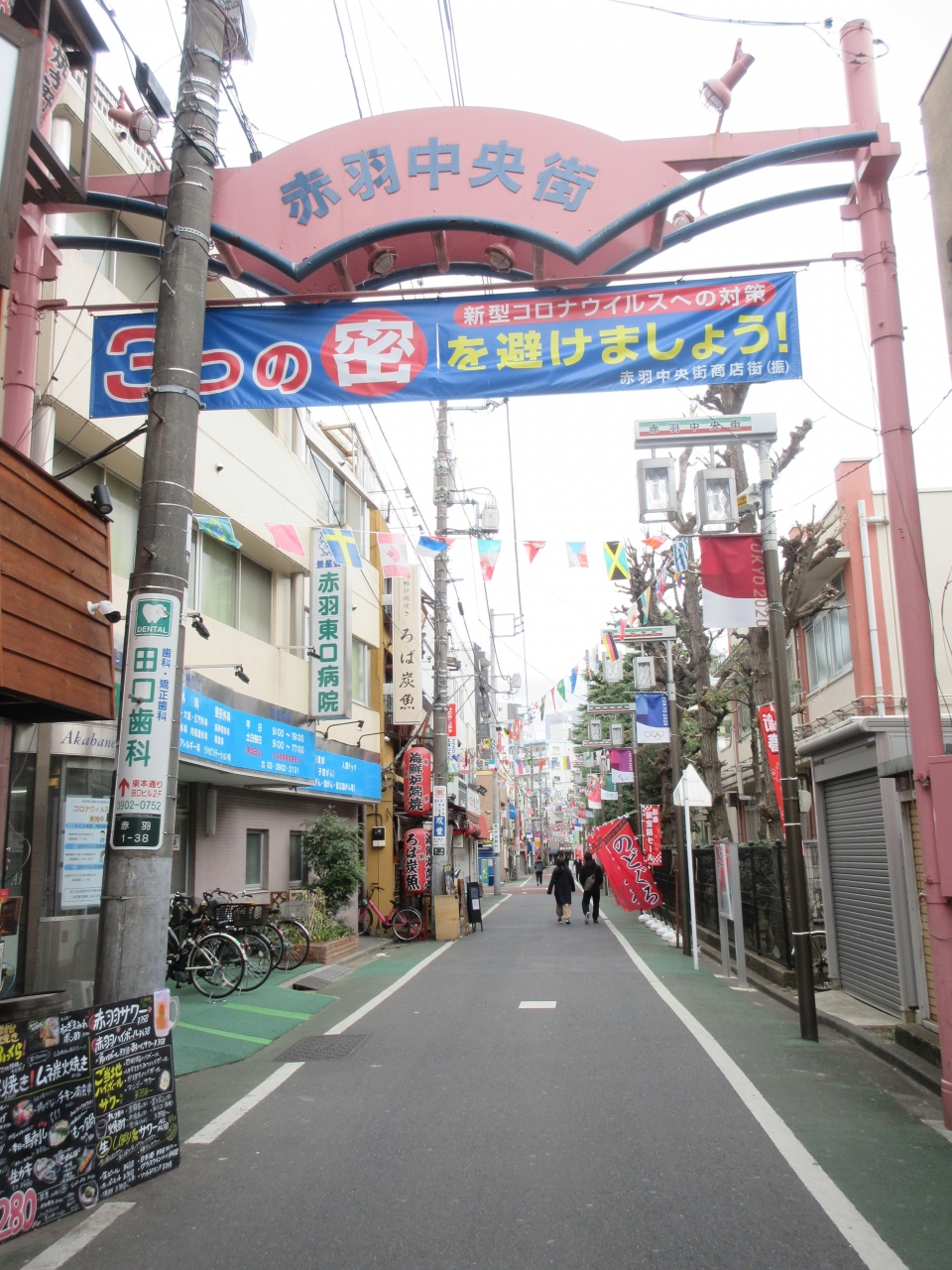 JR赤羽駅東口にある赤羽一番街商店街を入り、200mほど行った右手にある商店街です。長屋造りの建物の1階に炉端焼き店やスペインバルなどの飲食店や、赤羽らしい昼飲み屋が点在しています。子供たちが集まる駄菓子屋の隣に喫煙所が設置されていたのが気になりましたが、のぼりや万国旗などが多く掲げられ、歩行者天国の看板も用意され、街全体で商店街を盛り上げようとする雰囲気が感じられました。個人経営の店が多く、赤羽一番街とともに昭和の商店街らしさが残っています。