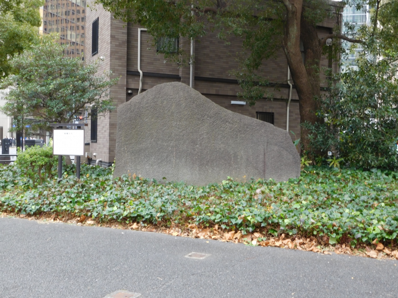 日比谷シティに近い「幸門」から日比谷公園の中に入るとすぐ、ちょうど交番の裏側辺りに、大きな「烏帽子石」が置かれています。石碑のように何か文字が書かれている訳ではなく、シンプルな石というか岩という印象でした。
