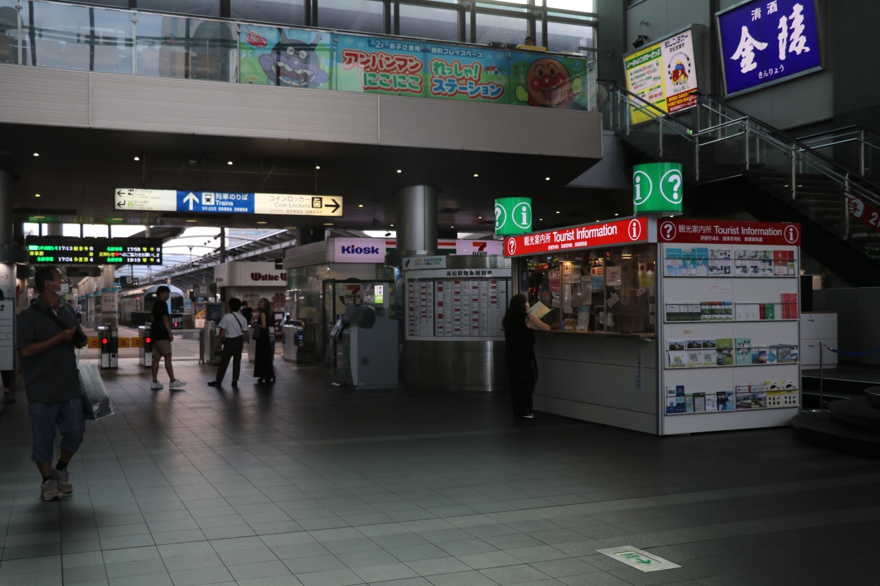 改札口の目の前にあり列車を降りた直後に利用する事が出来ます。逆に言うと車での訪問は周辺の有料駐車場に停めないといけないのであまりオススメできません。栗林公園など県内の観光地を中心にパンフレットが日本語・外国語問わず置いてあり誰でも使いやすいようになっていると感じました。中国語にも対応しているところを見るとアジア圏からの外国人などが多いのでしょうか?