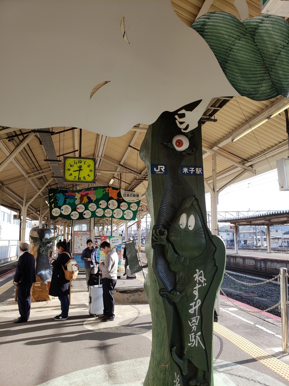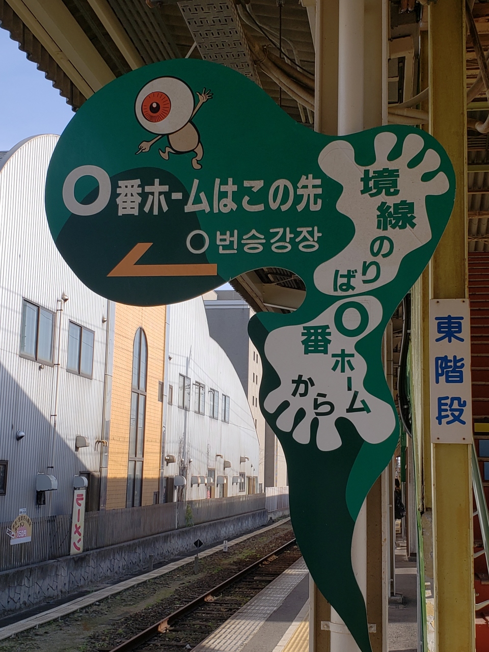 この駅には、ゼロ番線があります。境港に向かうジーゼル機関車のホームは、ゼロ番線。ねずみ男駅だそうです。他のホームは、まったくほかの駅と変わりありませんが、このホームだけは、独特です。とっても面白いです。