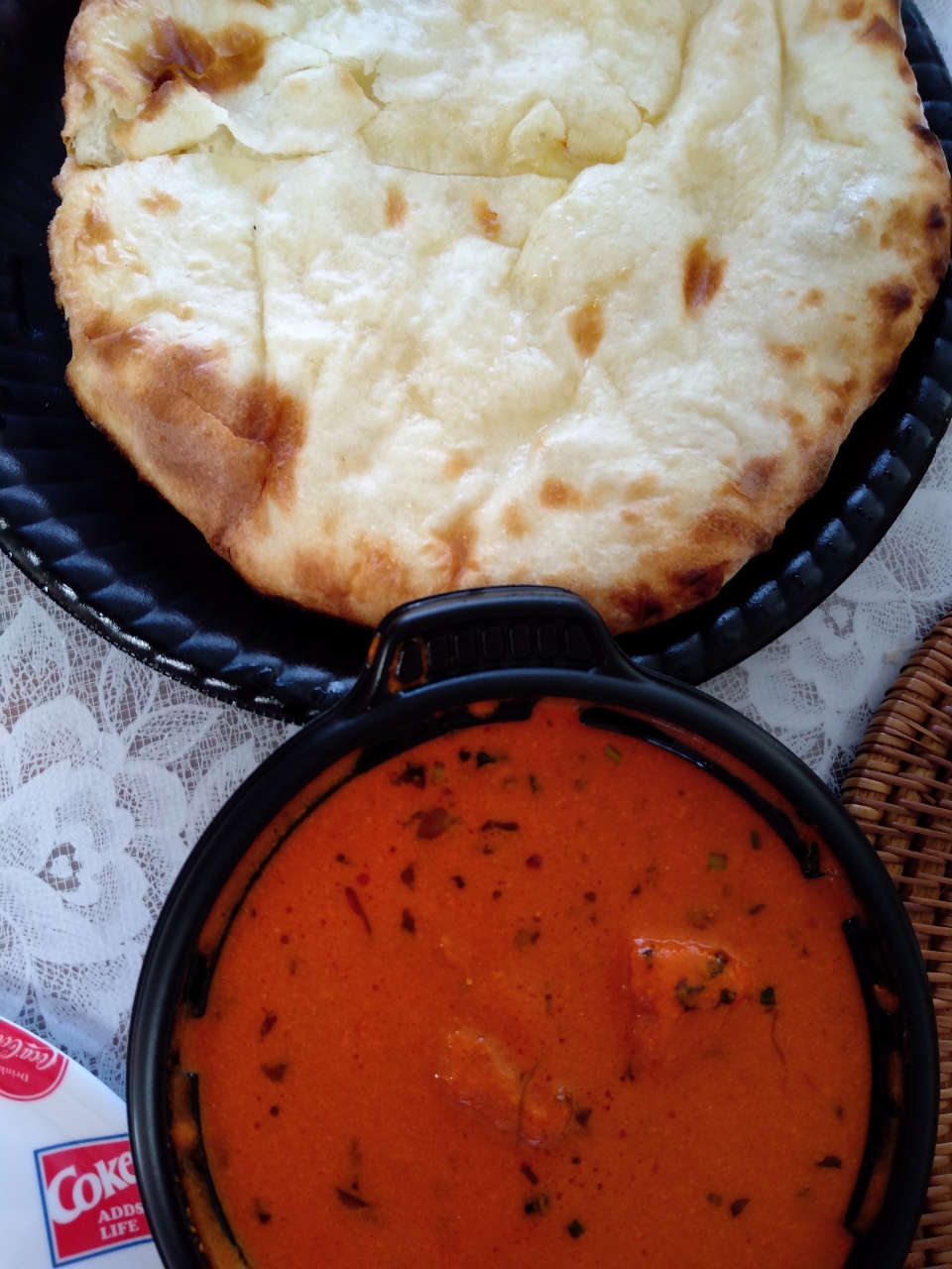 チーズナンはあつあつでおいしい。バターチキンカレーもおいしい。現金のみの支払いです。
