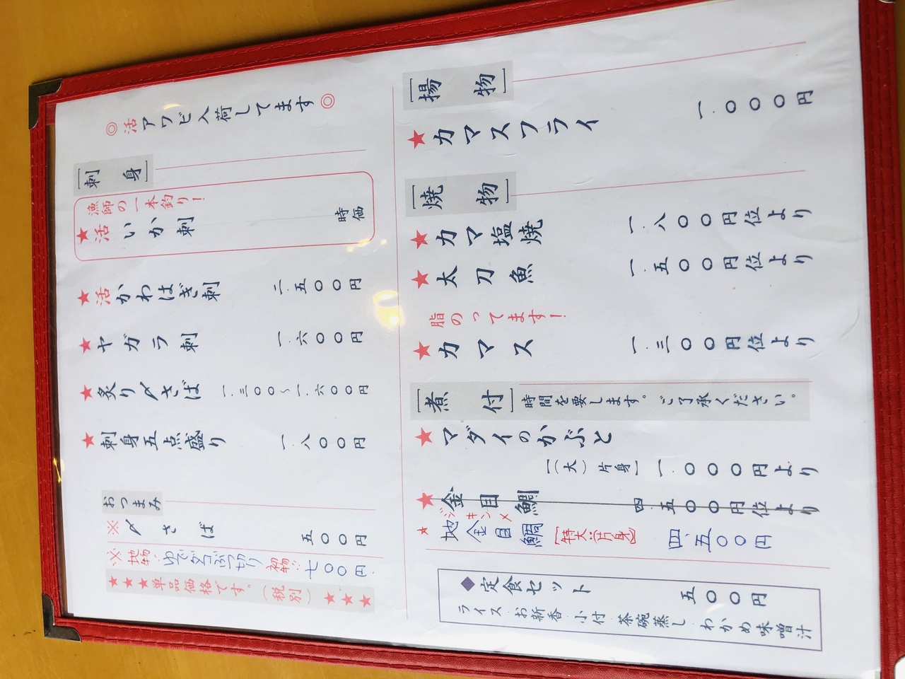 伊豆半島ドライブの途中<活イカの活き造り>のノボリ発見しランチで行きました。網代港一望出来る2階にレストランが有ります、時価の烏賊刺身&地魚の天麩羅注文し夫婦で食べました。烏賊はスルメ烏賊ですが空きとった鮮度抜群で美味しいです。
