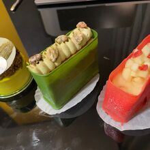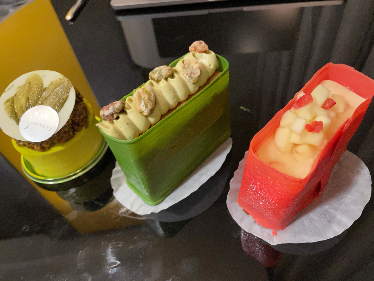 3種類のケーキを買いました。初めてのパティスリーで選ぶ際は直感と見た目です。基本的に「何これ見たこと無い」が判断基準です。品名を忘れてしまったので店のホームページで再確認したところ特に感動したのは「アフロ」というケーキです。
