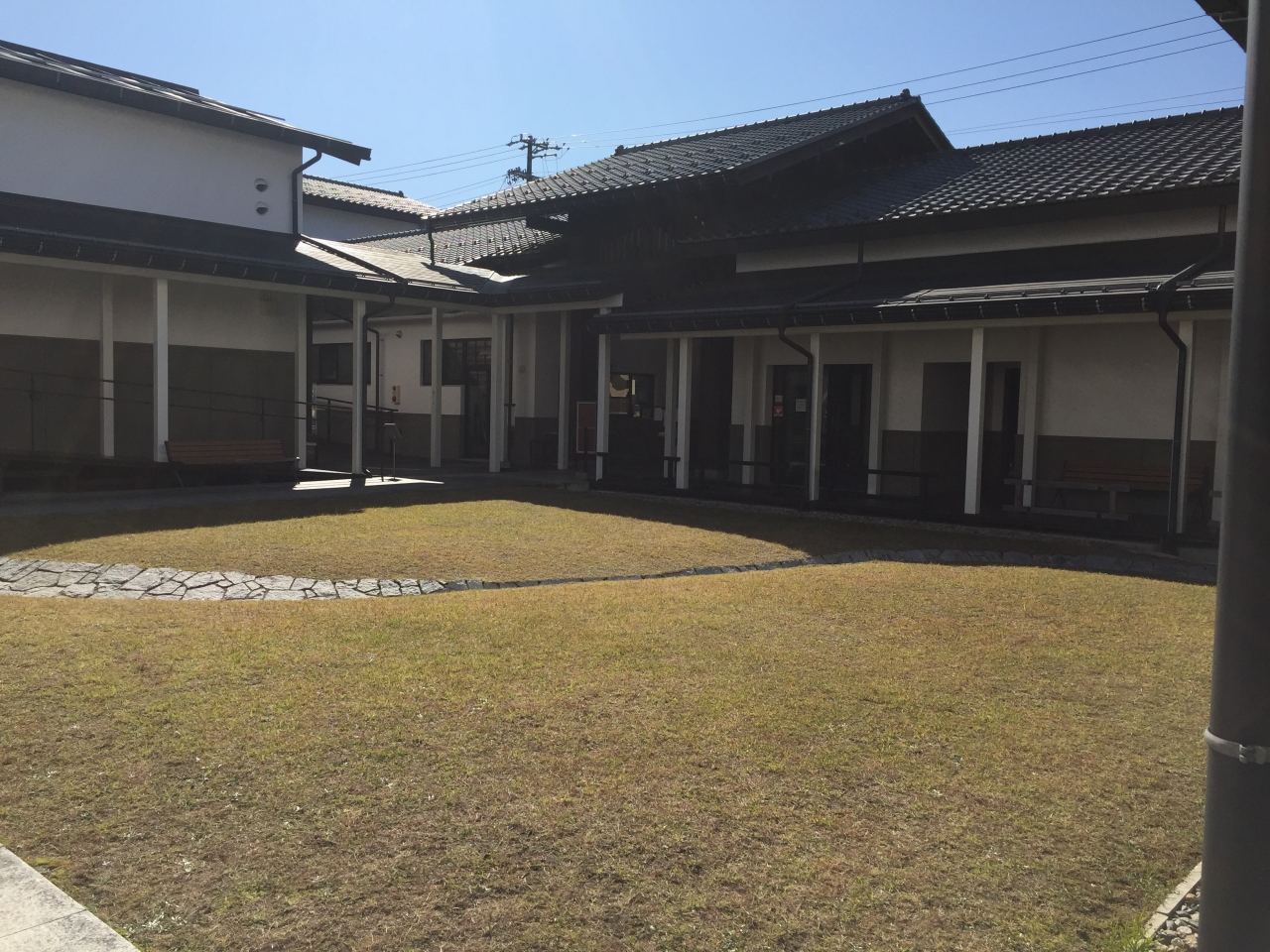 地元の高齢者が中庭のベンチで時間をつぶしたり、観光客がトイレを借りていたりするイメージ。