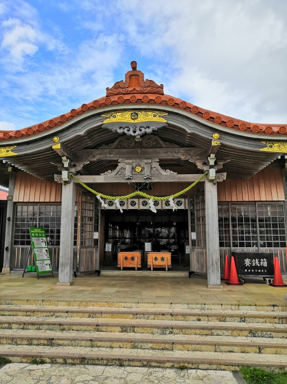 熊野三神と豊見親三神というニ柱の神様が祀られている神社です。神社本庁包括下の神社としては最南端だそうです。本殿の琉球赤瓦がいかにも沖縄らしさを感じさせます。狛犬はシーサーになっており、ここでも本土との違いを感じられます。