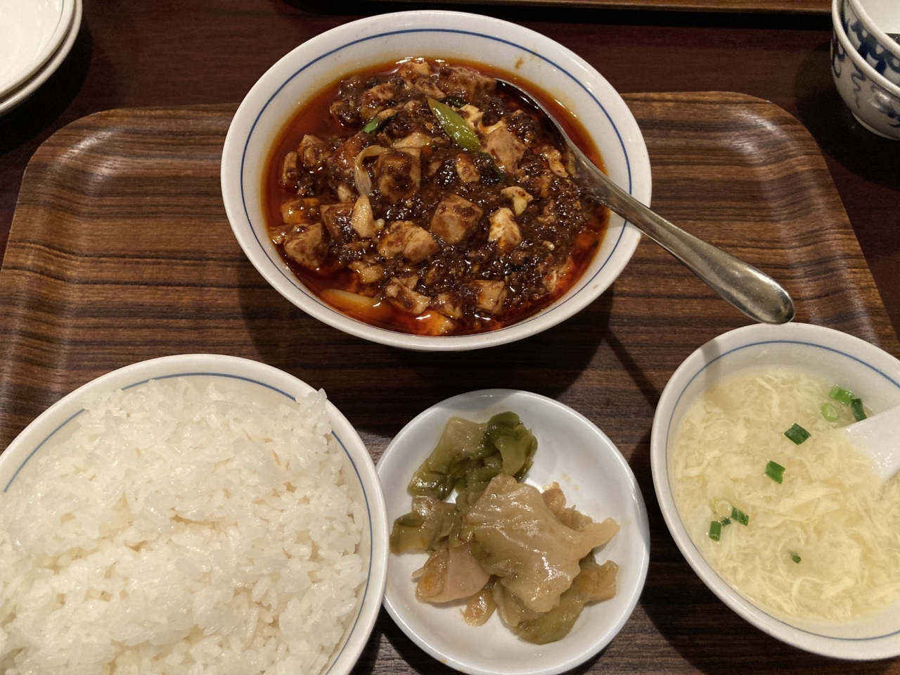 おすすめメニューから、麻婆豆腐セットと回鍋肉セットにしました。ご飯、搾菜とスープがつく定食です。