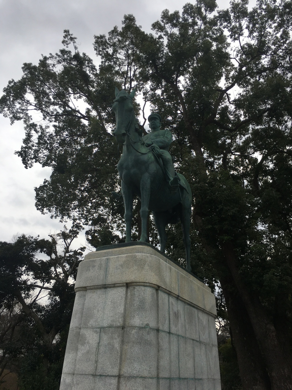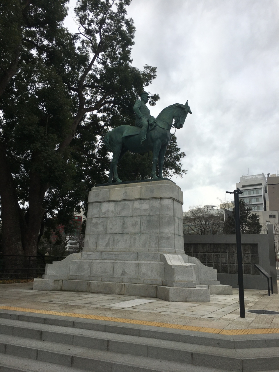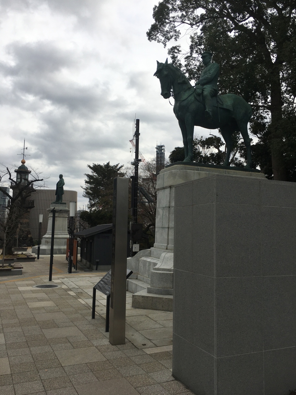 北の丸公園の田安橋付近に3つ並んだ像の右側にありました。立派な石の台座にのり馬に乗っていて、警備にでも出向くような姿でした。手前には説明文書があり、英訳もありました。像の顔立ちは穏やかな優しそうな表情でした。