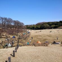 芝生にはワンタッチテントが並び、犬を連れる人々、親子連れで賑わいます。