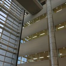 メインの出入り口は3階ですが、5階からも入退館ができるようになっていました。今回は、ちょうど、5階の催事スペースへ、退館前に足を運んだので、試しに5階から退館してみました。5階からもエスカレーター又はエレベーターを利用して、1階又は2階に降りられることが分かりました。もちろん、図書館ですから、図書サービスが軸でしょうが、こうした、導線の部分でのサービスも評価できると思いました。