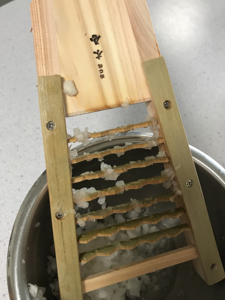以前から欲しかった大根おろしの道具【鬼おろし】。日本橋木屋のショーウィンドウに飾ってあり、お手頃価格だったので購入しました。サイズが二つあり、違いを質問してみたところ、適当な答えしか返って来ず対応にいささかがっかりしましたが、使ってみると水分がほとんど出ず、旨味の凝縮された美味しい大根おろしができました。