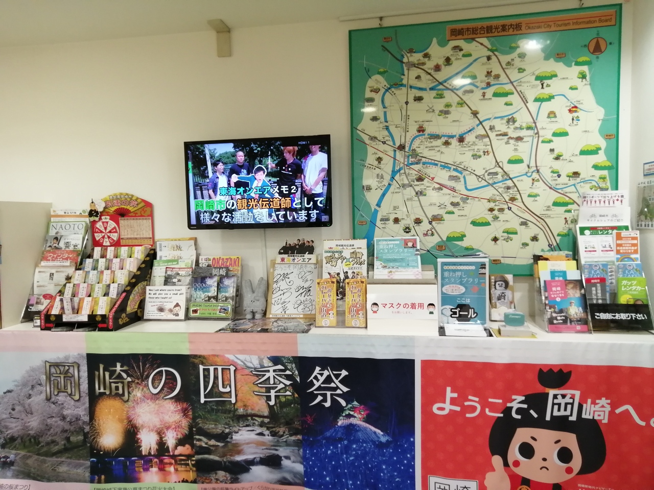 スタッフが1人常駐しており、観光パンフレット類が手に入りますがやや少なめ。ガッツリ資料がほしい方は市街中心部、東康生通りの籠田公園近くにある岡崎観光協会の事務所も兼ねた案内所の方へ行ってみて下さい。東康生通りの方は水曜日は休業日なのでご注意を…。