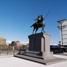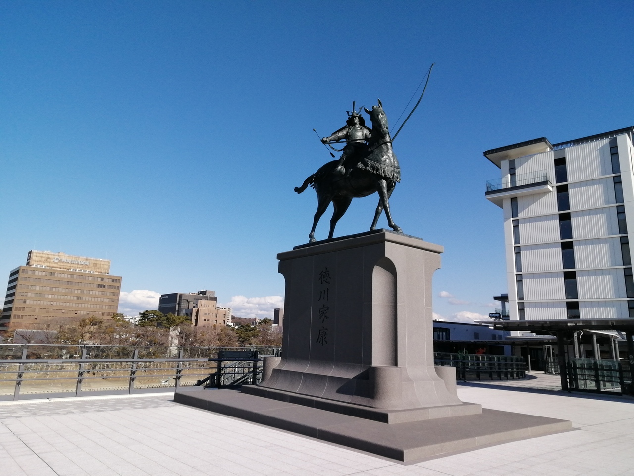 名鉄東岡崎駅から乙川沿いにある商業施設「OTOリバーサイドテラス」通ずるウォークデッキ上に建っています。台座の上の見事な騎馬像が青空に映えます。2019年11月に完成。像のサイズは高さ5.3mで騎馬像としては日本最大級とか。岡崎公園内にある家康像とは対照的に若々しい姿をしています。松平から徳川に改姓した25歳当時の姿のようです。