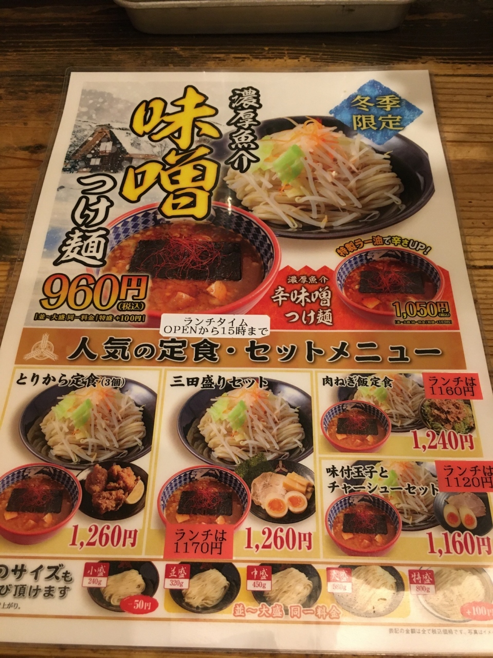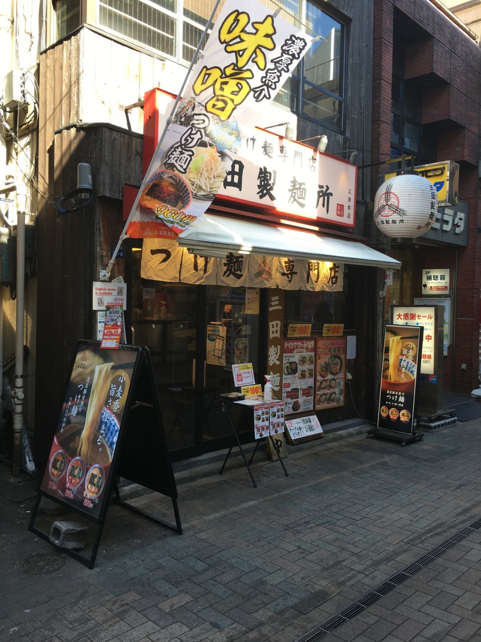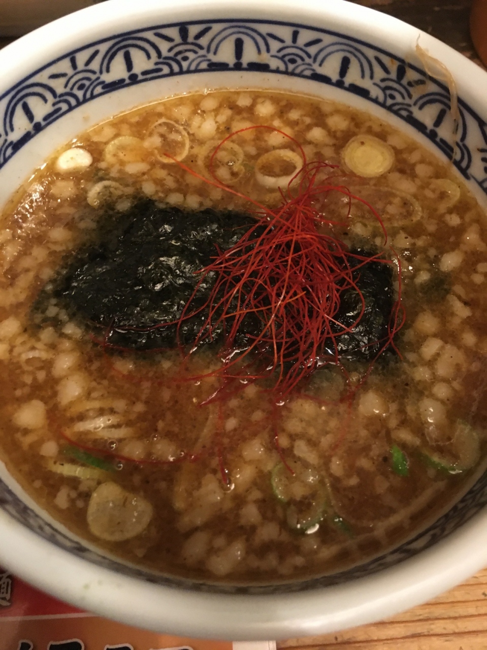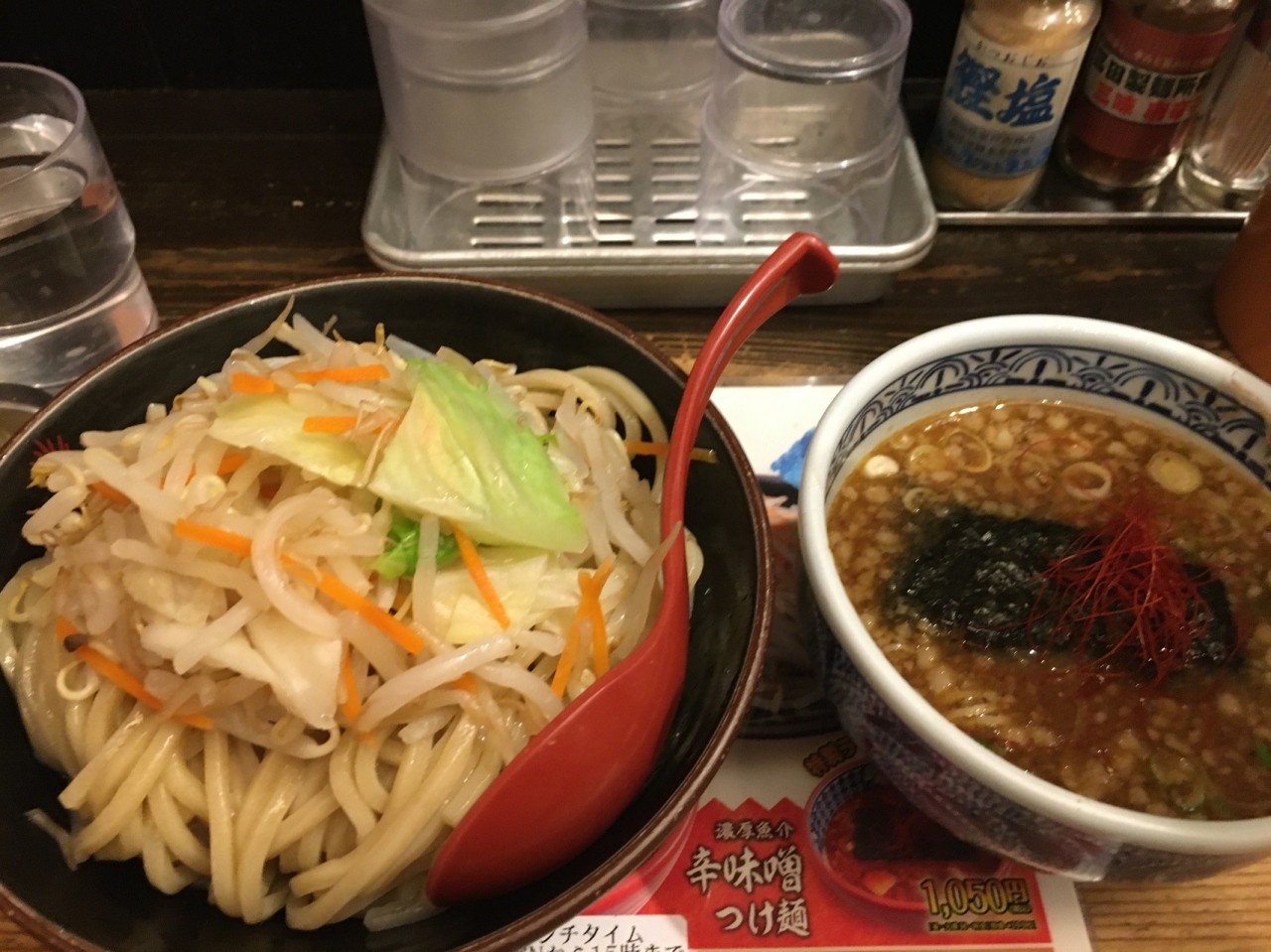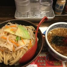 カウンター10席ほどの店、2階にも座席があるようでした。店員さんおすすめの味噌つけめんを食べました。麺が極太で野菜も少々入っていました。濃厚な魚介のスープで、大きめのメンマが3つ入っていて、チャーシュー門も柔らかめでした。