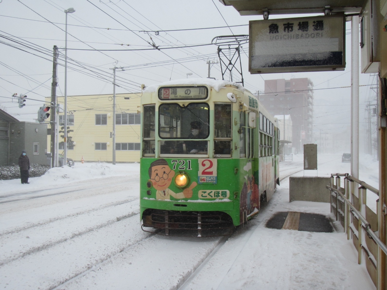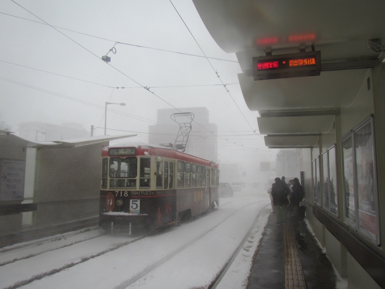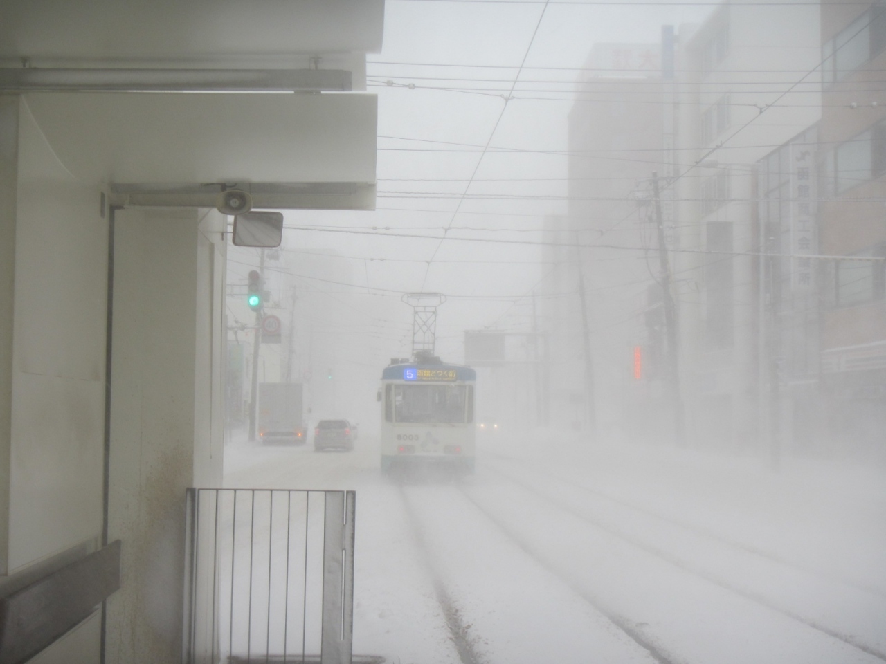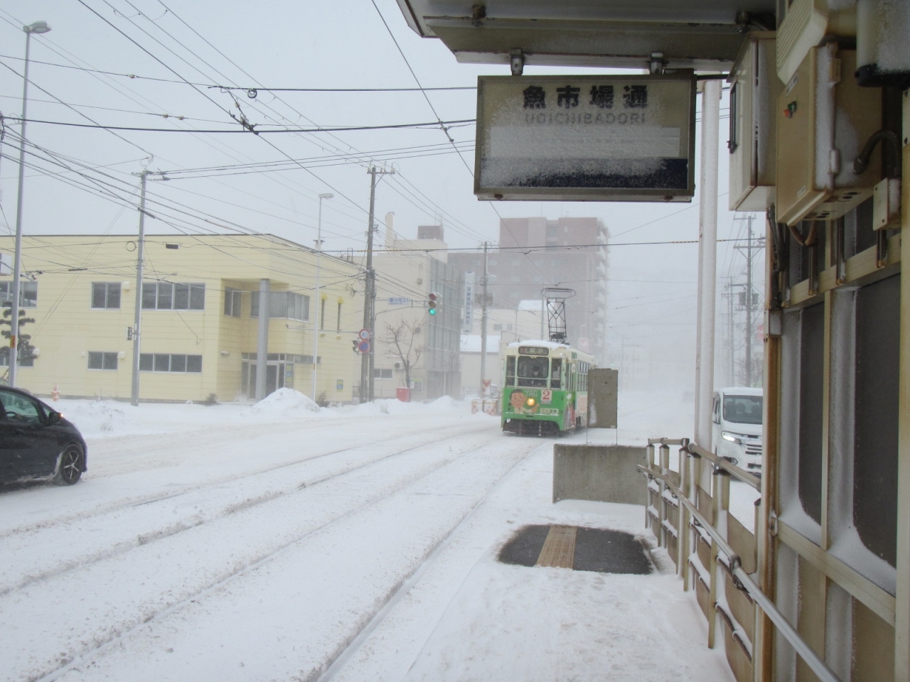 函館市電の車内も例外ではなく、訪れた時は気温-7℃で強風の吹雪模様にも関わらず、停車した電停ではお客の乗降によらずドアが開放され、車内換気がなされていました。