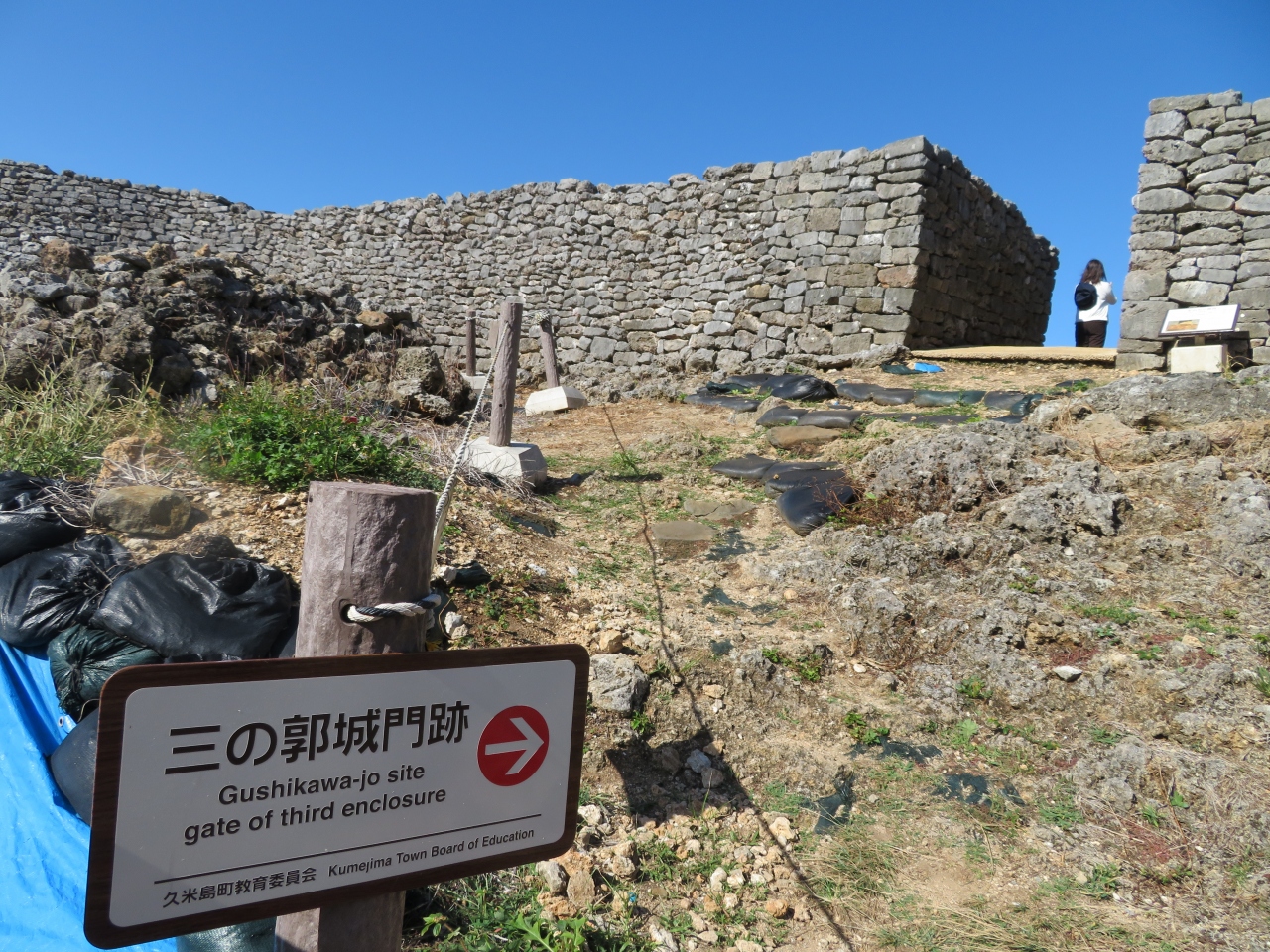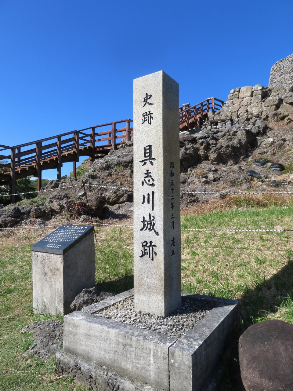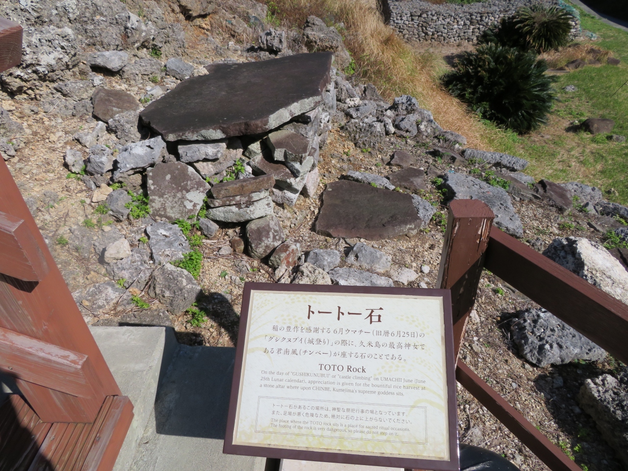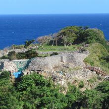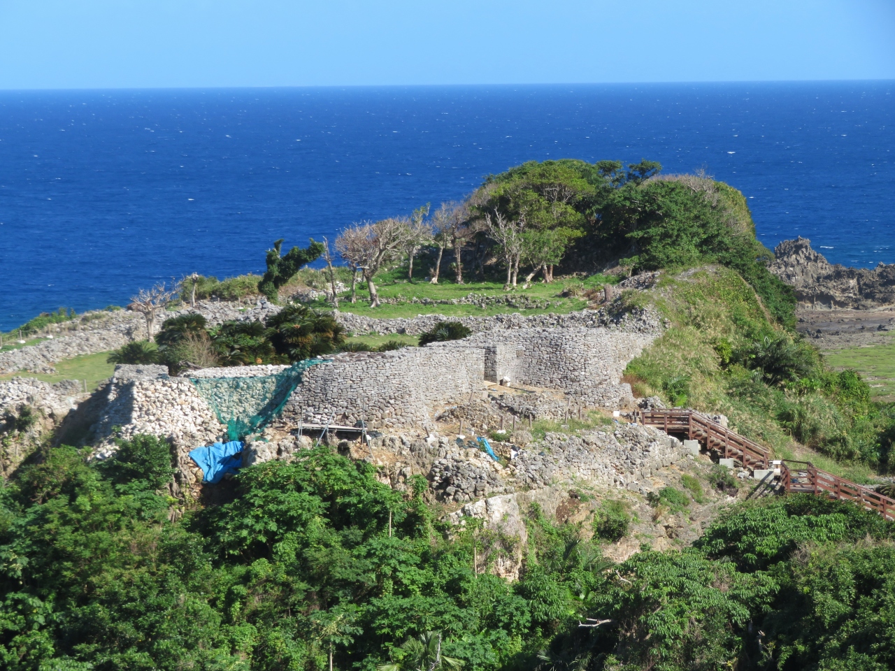 海を背景に全景も素敵でした。石垣が残る程度ですが、往時をしのばせるものがあちこちに見られます。現在も修復中のようです。野積みの石垣の周りにもごろごろと石が残されています。琉球時代から続く最高神女による祭祀が現在も行われている由緒ある城です。
