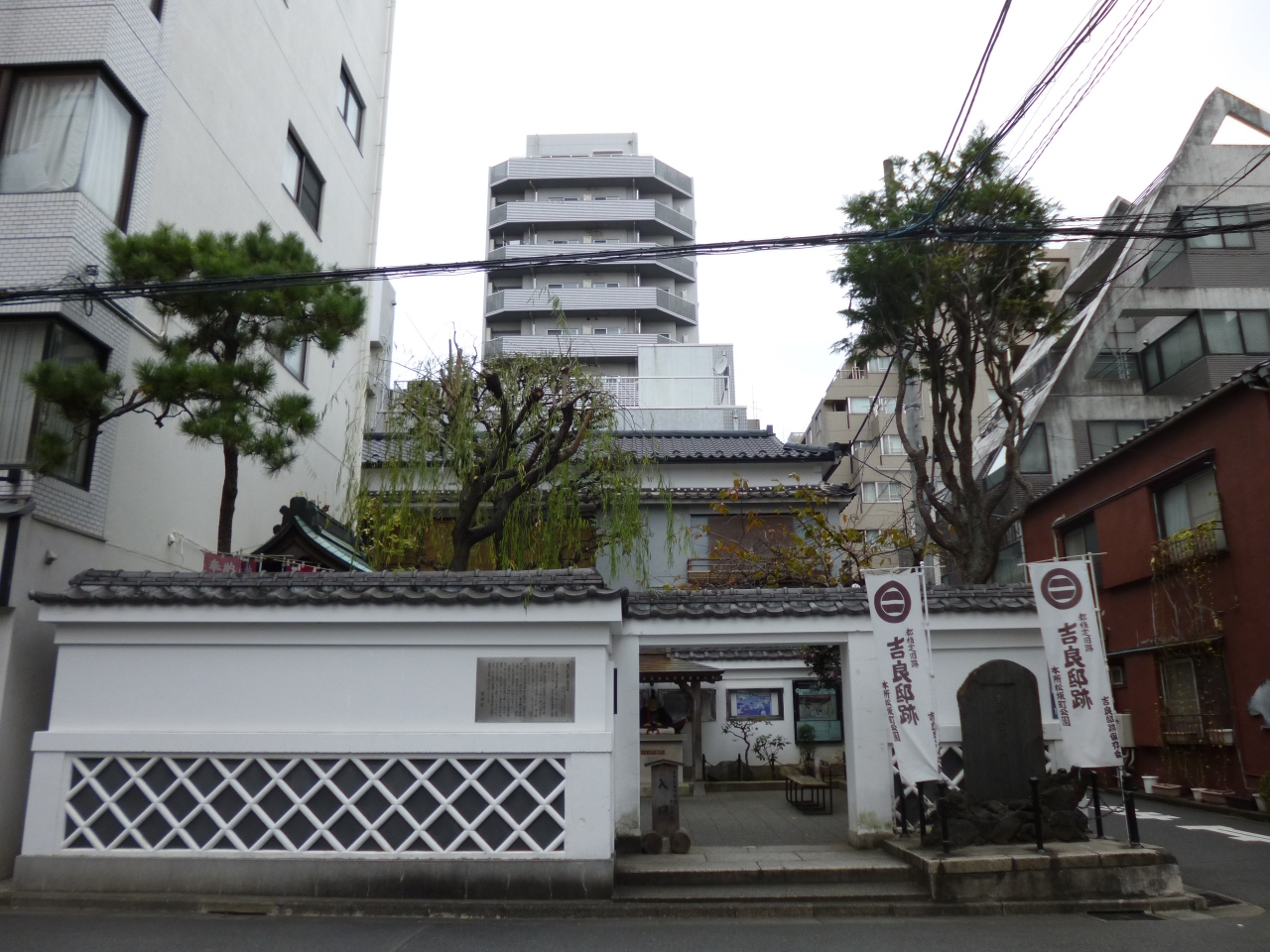 回向院の東側、」吉良邸上屋敷跡の一部が小さな公園となっています。公園を囲む塀と門は身分の高い家であることを表す形式の長屋門を模したもののようです。公園内部は、邸内あった松坂稲荷神社があり、きれいに整備されていました。