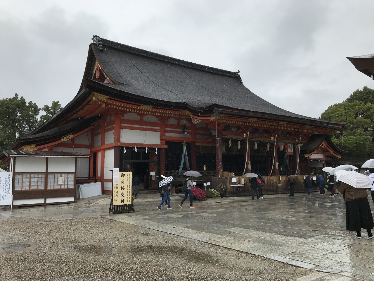 東大路通りに面した西楼門をくぐり、右へ折れて道なりに進んでいくと本殿前にでます。本殿はスサノオノミコトとクシナダヒメとヤハシラノミコガミを祀るといわれ、本殿と拝殿が同じ屋根の下にもうけられた珍しい様式で、祇園造りと呼ばれているようです。本殿前は、いつも多くの人で混み合っています。