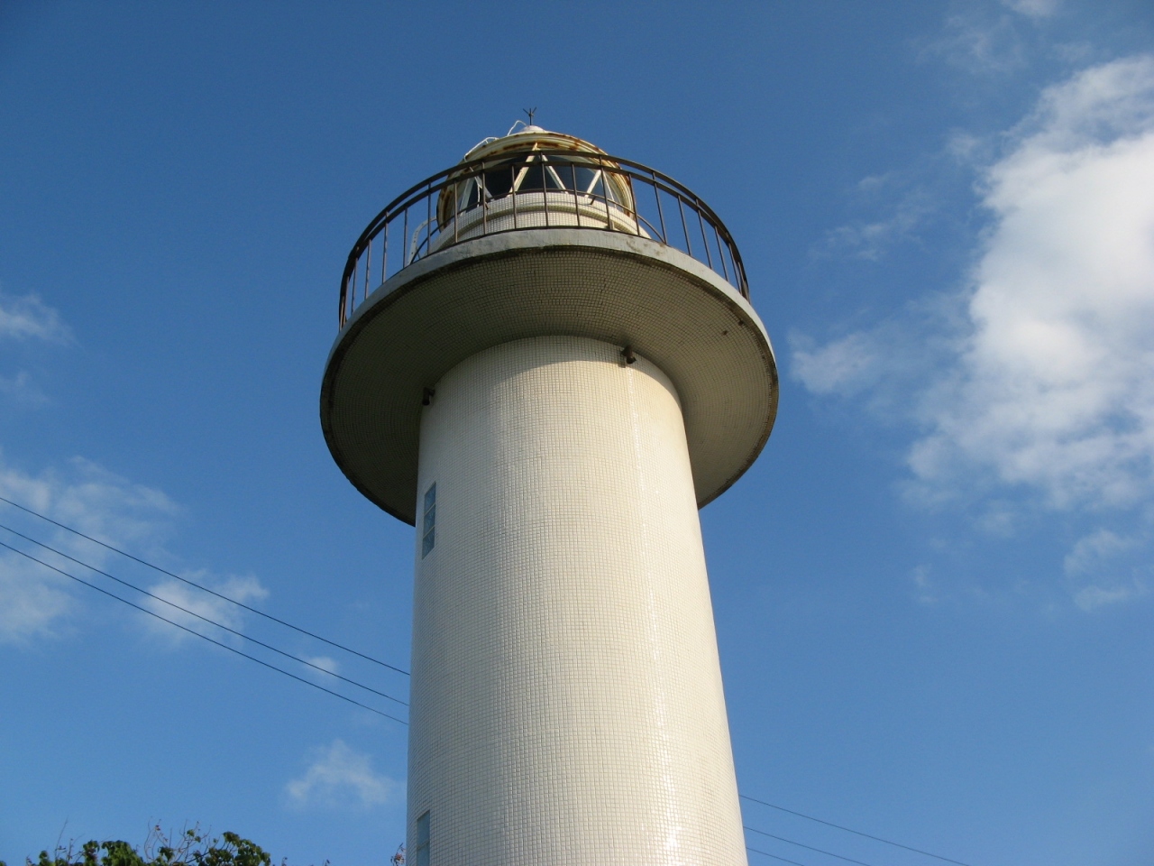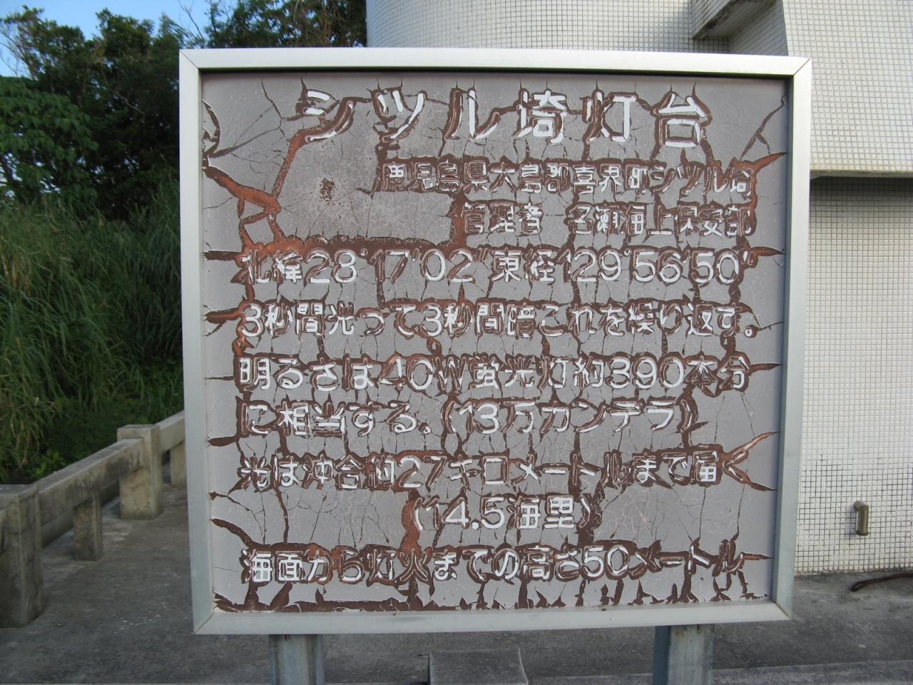 灯台と言っても海岸沿いに立っているのではなく、海岸から500mほど離れた喜界町上嘉鉄集落の中心から山側、サトウキビ畑の中に入って行くところ、保食神社の近くに立っています。現地にあった説明板(添付写真参照)によると、海面から灯火まで50m、光の到達距離は27kmだそうです。灯台の周りは草木がぼうぼうに生えていて海側の眺望は全くなかったのが残念でした。