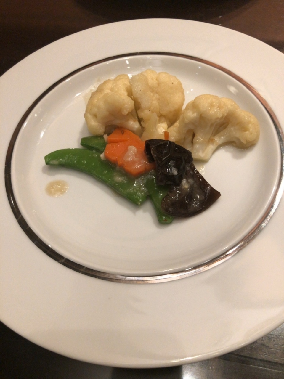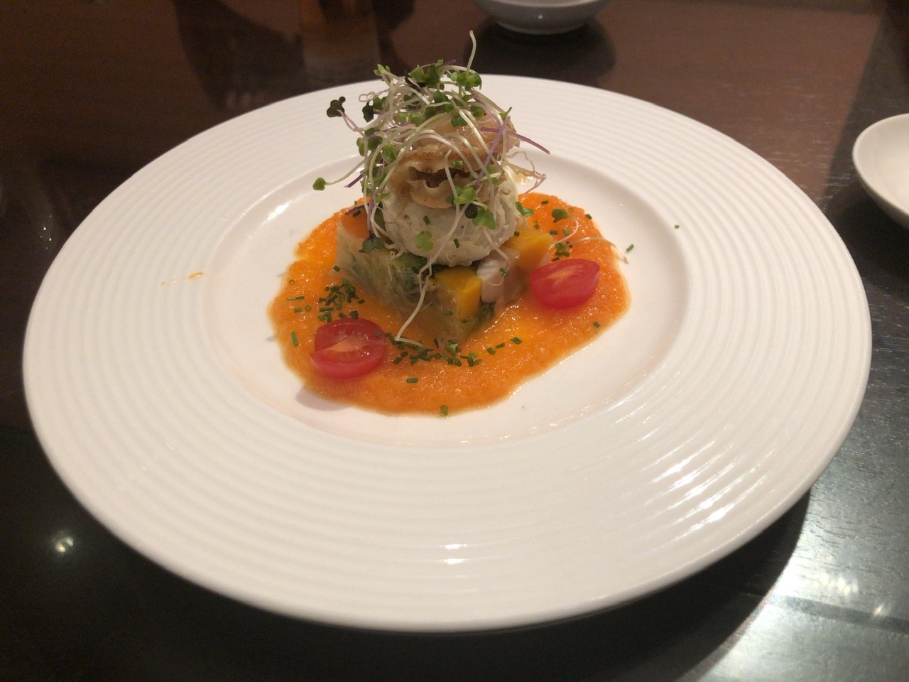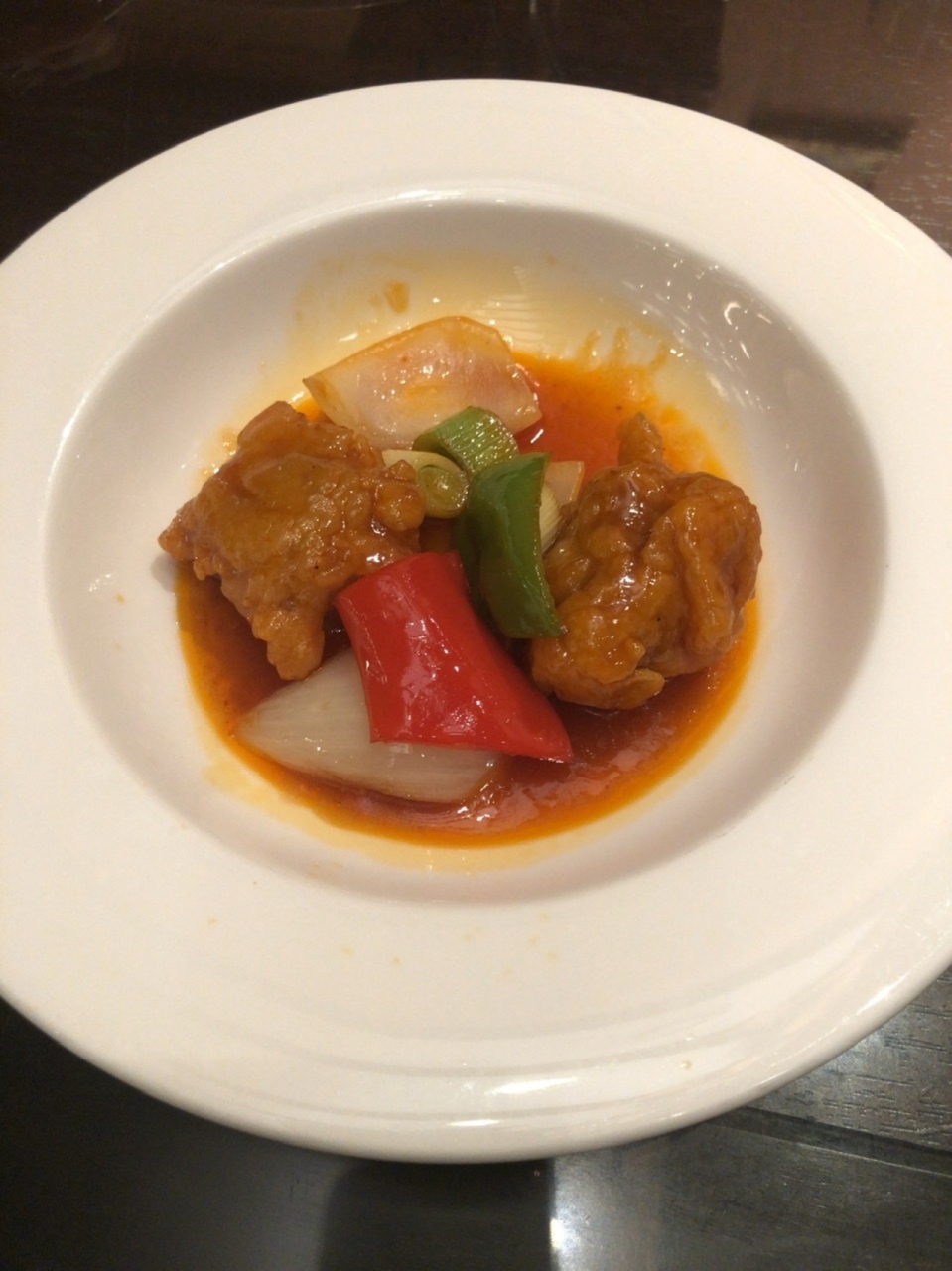 一品目の冬野菜のテリーヌからこれはフレンチ?と間違えてしまいそうな上品な一皿が出てきました。次はフカヒレスープ、エビすり身のいがぐり揚げはボリューム満点、冬野菜のニンニク炒めは野菜がシャキシャキ!小籠包、カニ餃子、海老のキシメン包み、伝統の酢豚、海鮮ごはんオジヤ仕立て、デザートはマンゴープリンと杏仁豆腐でした。