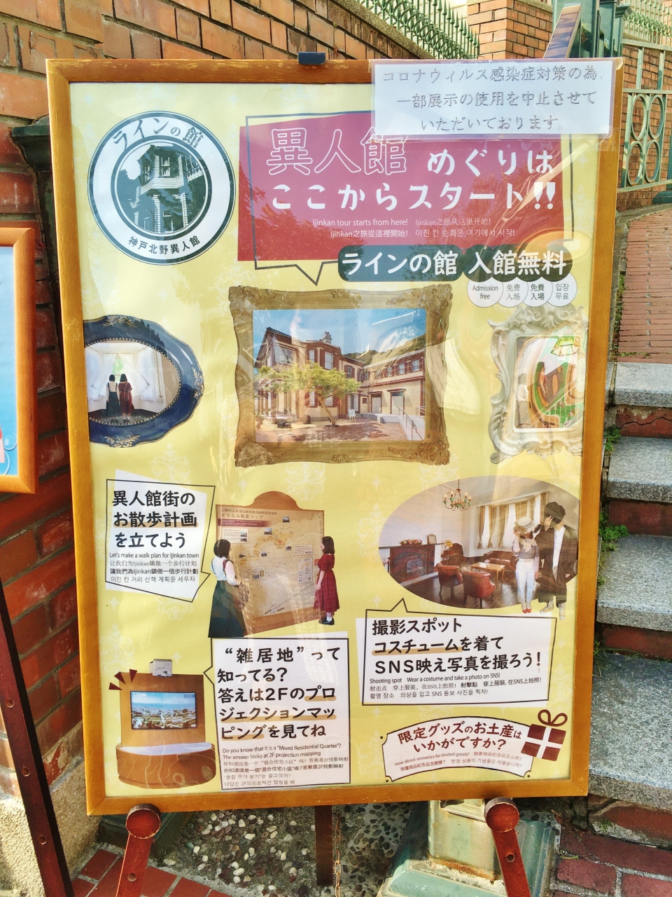 シティーループのバス停の近くにある北野異人館で、有料の異人館が多い中入場無料で入れます。新型コロナウイルスの影響で展示室は一部のみとのことで、今回は見学は見送りました。外観は数年前に補修工事を終えたこともあって、茶色とベージュの外壁がまだ新しく綺麗でした。次回は新型コロナが落ち着いたころに訪れ、中に入って館内の見学をしたいと思います。