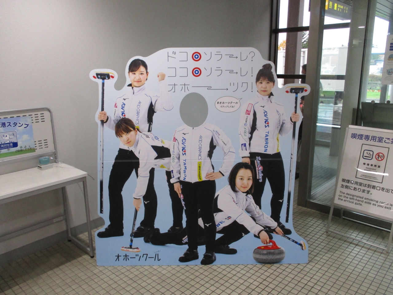 女満別空港に到着するとロコ・ ソラーレの皆さんが迎えてくれました。空港利用者のなかで、記念撮影をする人も見かけましたが、一緒に記念撮影できるようになっていました。旅のいい思い出ができるいいサービスだと思います。この写真を見て、網走地方はカーリングの街であることを思い出しました。
