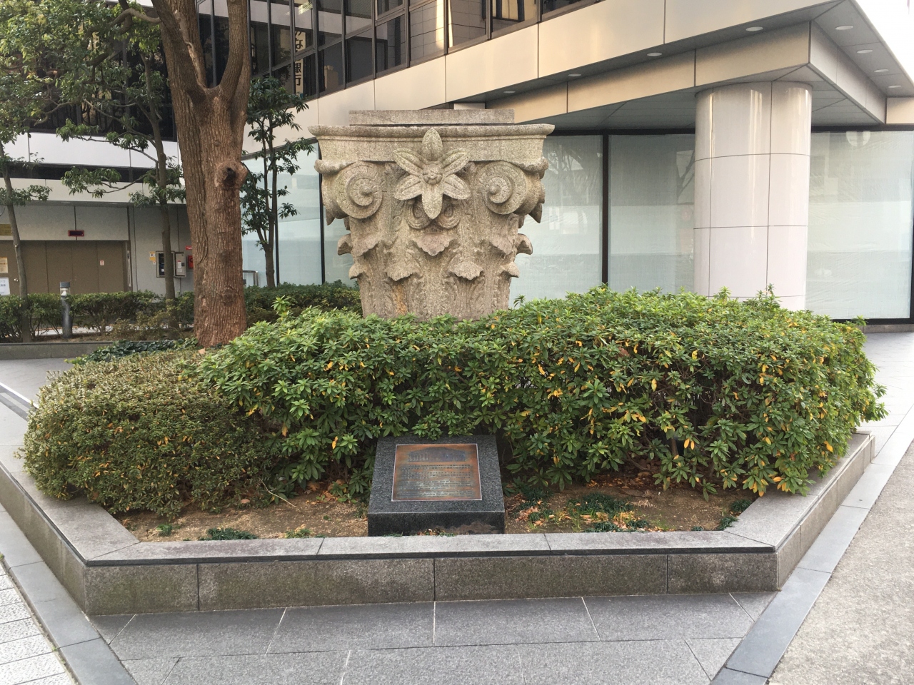 神戸大丸の東隣にある三菱東京銀行神戸支店前に置かれています。1929年に建設された三菱銀行三宮支店の柱頭部分ですが、知らないと巨大なオブジェのようです。ギリシャ建築風で彫刻が施されとても存在感がありますが、なぜ柱頭部分だけがここに置かれているのかという疑問が残りました。