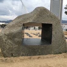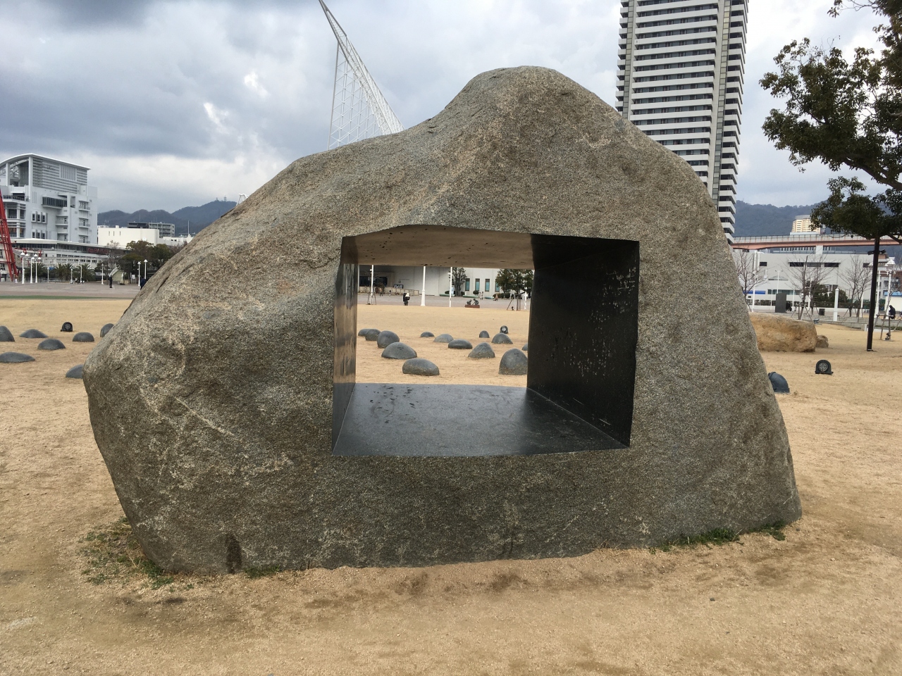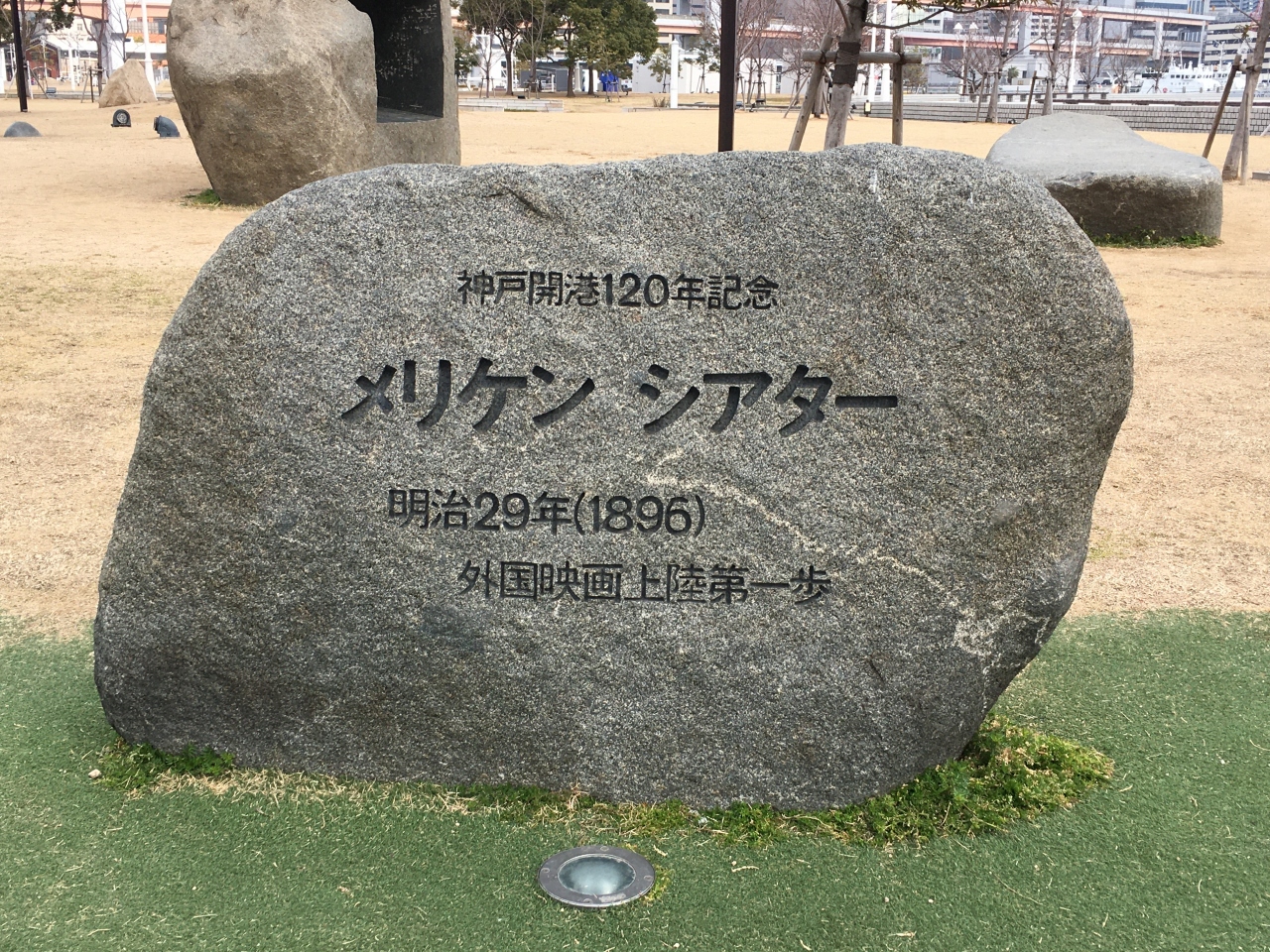 神戸の海岸沿い、メリケンパークの南側にあるオブジェです。1896年に日本最初の映画が神戸で公開されたことを記念してつくられました。四角い枠をスクリーンに見立てた高さ3m、幅4mの石のオブジェの周囲には、往年の映画俳優の名前が刻まれた小さな石碑が並んでいます。神戸は街を歩くとオブジェやモニュメントが多くあり、歴史を感じます。