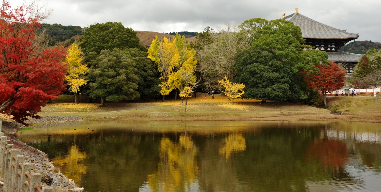 奈良盆地には農業用のため池が多い。人口密集地である平安京を控え、昔から二毛作というフル回転の生産方式を採用していたが、その弊害として慢性的な水不足に悩まされていたからだ。大仏池も安土桃山時代に築造された農業用ため池だったという。現代はその役割はあまりなく、景勝地として人々の心を潤している。紅葉シーズンに足を運んだが、水面に紅葉と黄葉が映り、背景に大仏殿や山々が連なる光景にしばし見入った。意外とイチョウの大木が多く、地面に敷き詰められた黄葉を歩く鹿の姿が被写体として人気を集めていた。