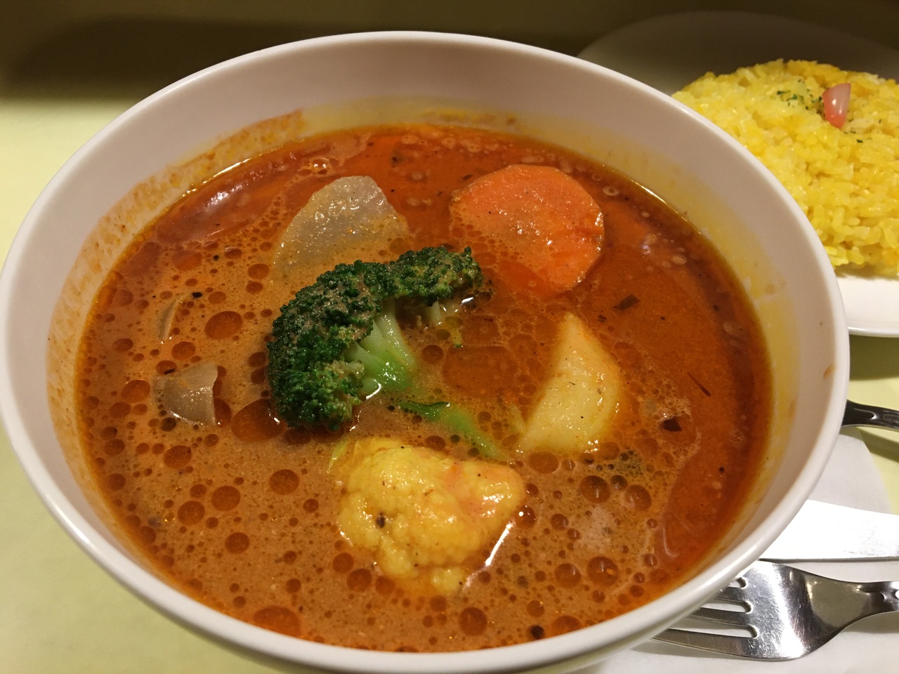 汐留駅から歩いて向かいました。5分くらいで到着。大きな看板が目立っていました。金曜日の開店時間に来店。一番乗りでした。定番のとりカリィも悩みます。チキンレッグが柔らかそうです。「ヨーグルトとトマトの酸味が効いたスープ」という言葉に惹かれて、カシミール野菜カリィ(1350円)をチョイスしました。スープをひと口飲んでビックリ。クリーミーで美味しい!野菜がゴロゴロ入っていて大満足のカレーでした。