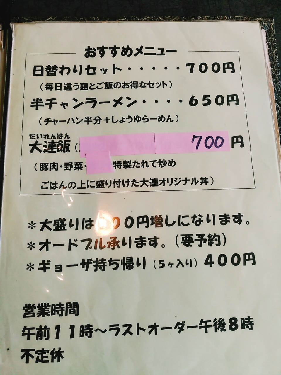 名取市の北部、旧国道4号線沿いにあります。セットメニューがお得なお店です。半チャンや半カレーラーメンが650円です。今回は、日替りラーメン700円をいただきました。タンメンと半チャンのセットです。タンメンはあっさりの具沢山でした。半チャンはあまりパンチはありませんでした。