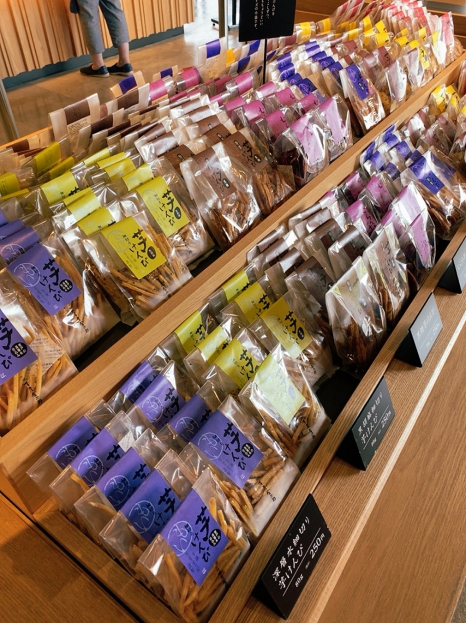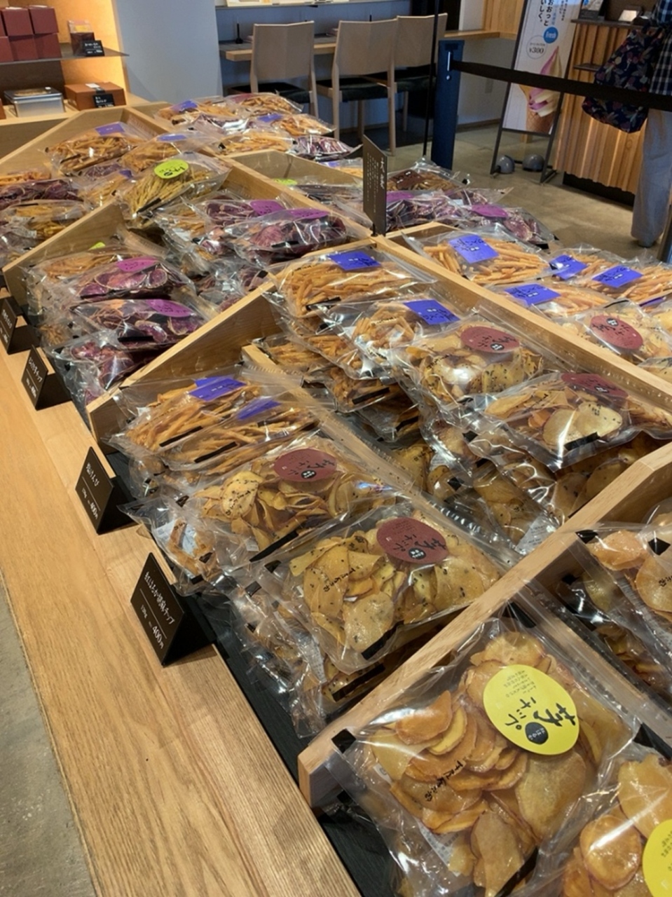 このお店の揚げたて芋けんぴは超人気で、地元の人、観光客がどんどん訪れて買って行ってました。 芋けんぴ専門店として東京の日本橋にも出店してるくらい人気店という事ですね。 お土産屋さんやスーパーで見かける大袋の芋けんぴや芋チップと比べるとかなり値は張ります。 でもおいしかったです。 期間限定のチョコがけ芋けんぴを1番楽しみにしてたのですが、美味しかったけど、チョコをかけた事で芋の味が消えちゃってるなーと感じました。
