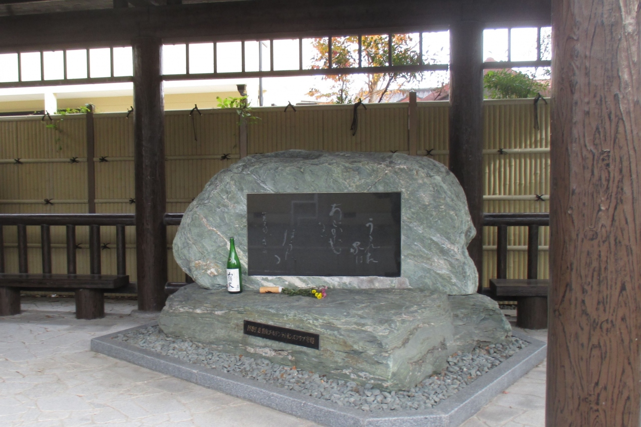 種田山頭火生家跡に、大きな種田山頭火句碑がありました。ここはふるさとですから、有名な「雨ふるふるさとははだしであるく」を採用しているかな・・・と思って見たら、「うまれた家は あとかたもない ほうたる」でした。大地主だった土地がなくなり、起業した酒蔵が潰れてしまったことを思い出したのでしょうか。