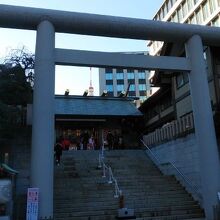 周辺はビルが並ぶ都会的な場所で、社殿は鳥居をくぐって階段をのぼってすぐのところに鎮座していた。50メートル超の参道も街中の雰囲気。