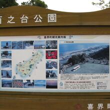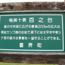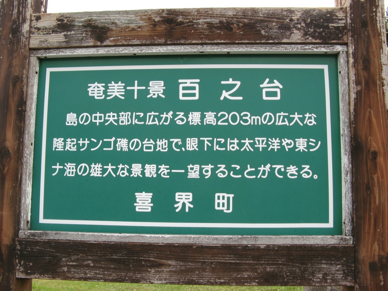 喜界島の中央部の高台にある公園です。現地にある説明板(添付写真参照)には『標高203m、約700ヘクタール、広大な隆起珊瑚礁高台地で奄美十景の一つ。』とありました。