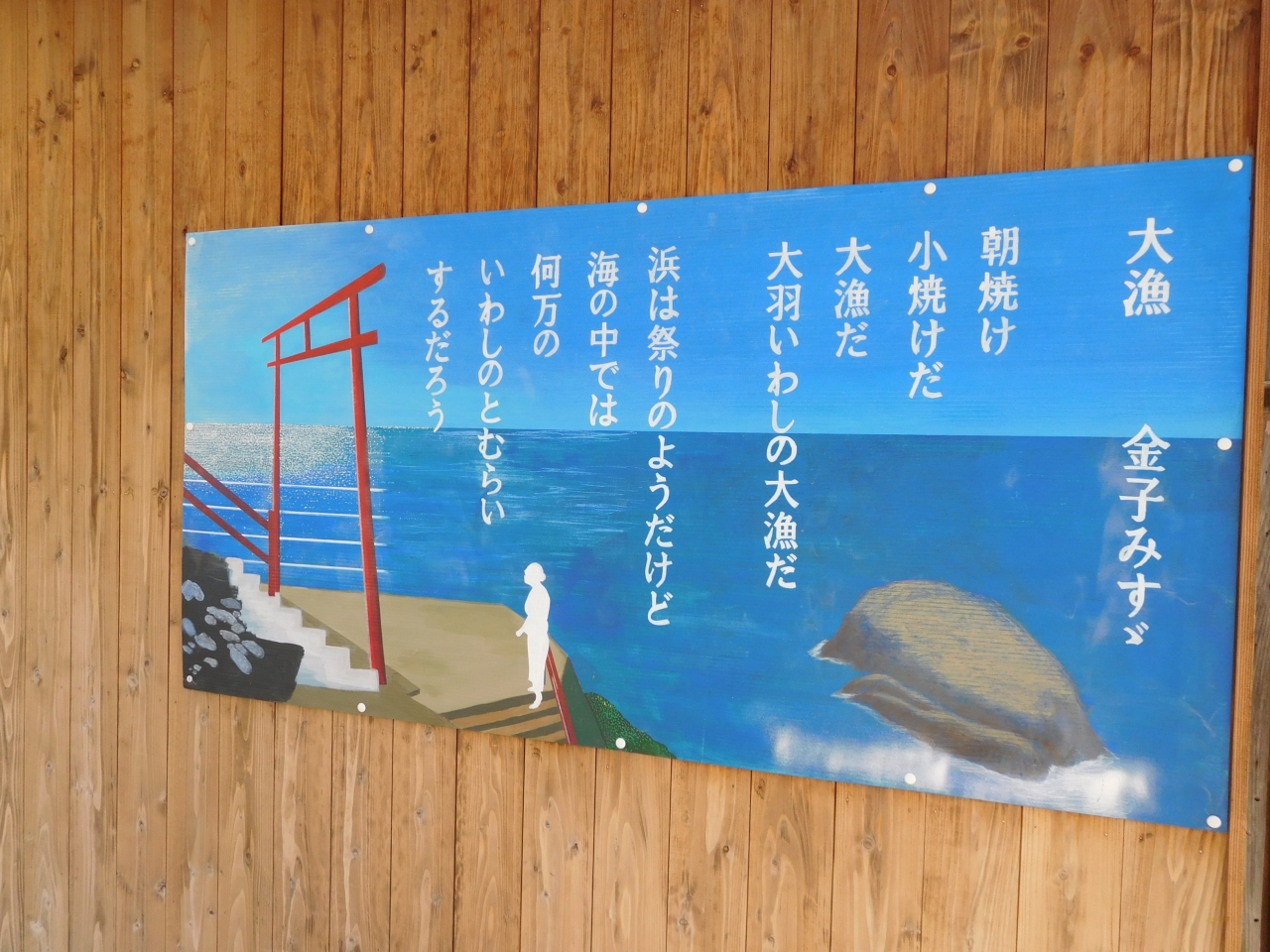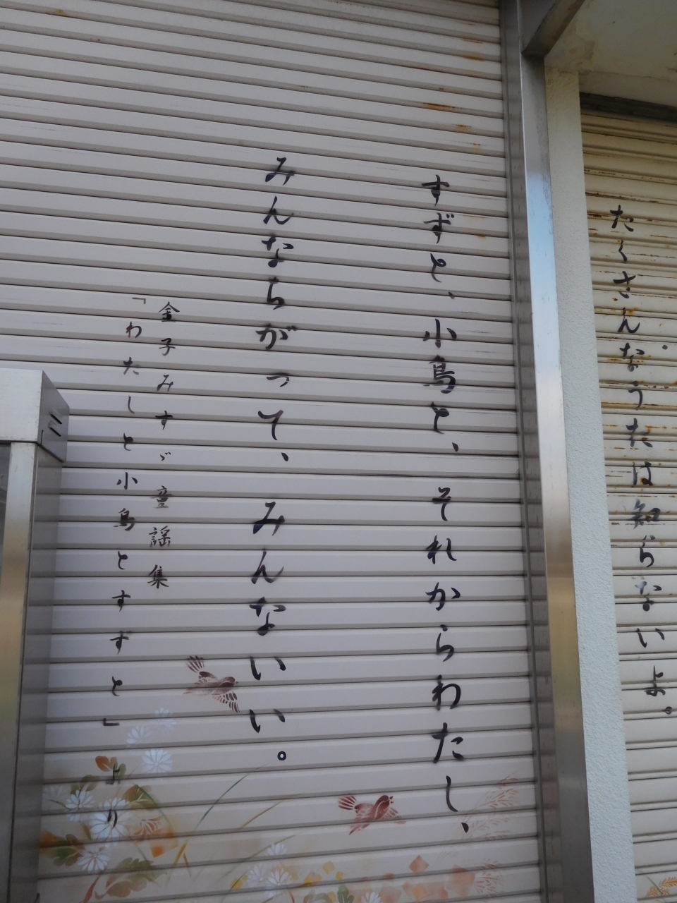 センザキッチンや仙崎駅の近くです。通りに金子みすゞ記念館など観光スポットがあります。シャッターや壁などに金子みすゞさんの詩などが書かれています。